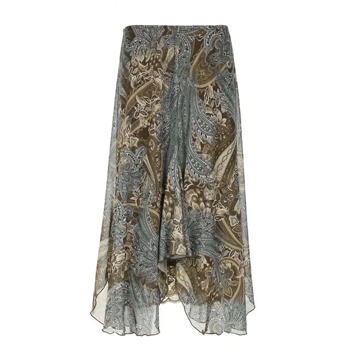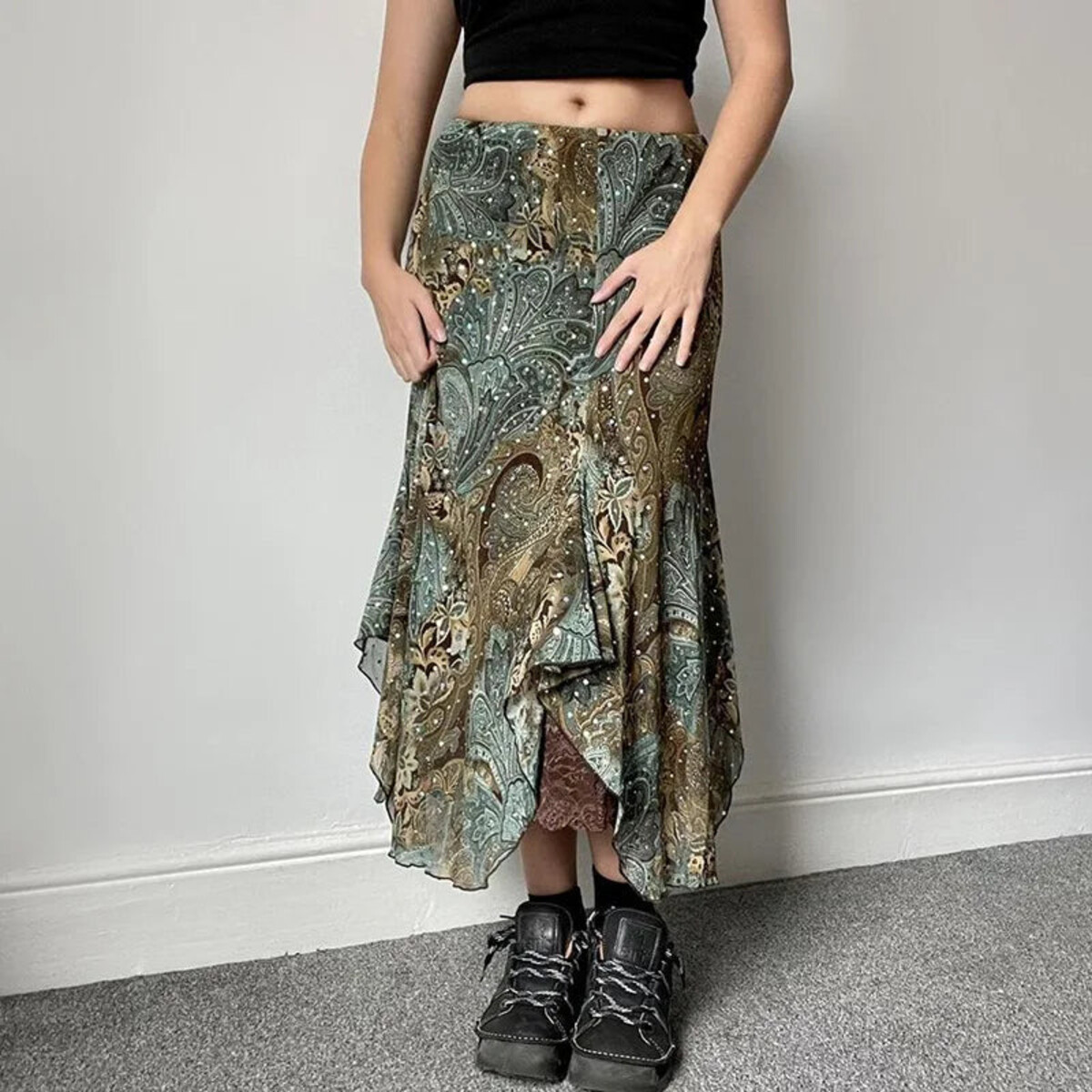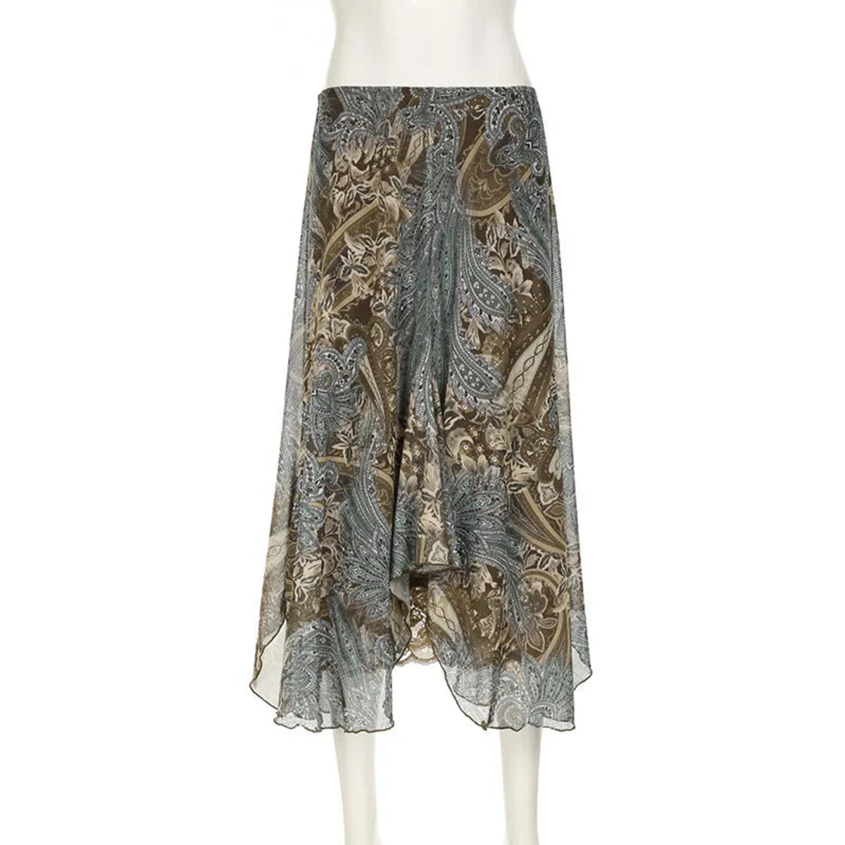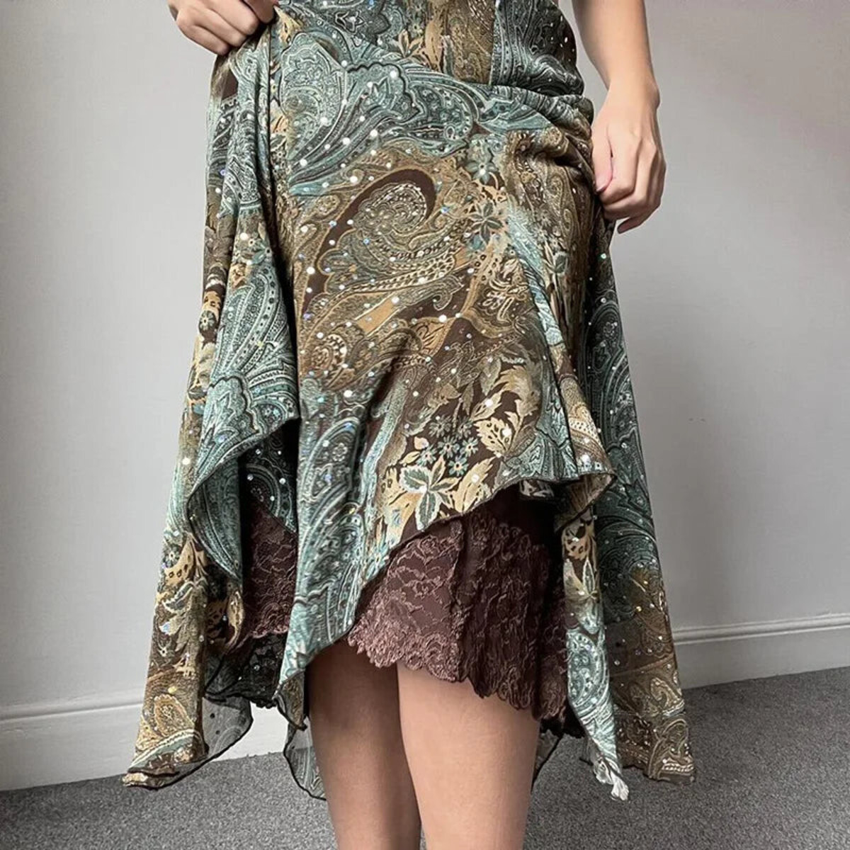 Like something straight out of a midnight garden party or perhaps the soft-lit, day-after ritual, this skirt is what happens when floaty whimsy collides with serious craftsmanship. The handkerchief hem makes you want to twirl - and even if you’re not the “twirly” type, it’ll do it for you when you walk anyway. There’s a soft paisley mesh overlay that gives little glimpses of skin with its nearly-sheer cutouts - and really, no one ever minds a little mystery. Sprinkled in there are small rhinestones for when you want to catch the light but aren’t up for sequins (who is on a Wednesday?). The stitched-on floral lace underlayer adds just that bit more coverage and textural contrast at the hem, and here’s the kicker - it comes in complementing hues to the overlay, so they never clash.