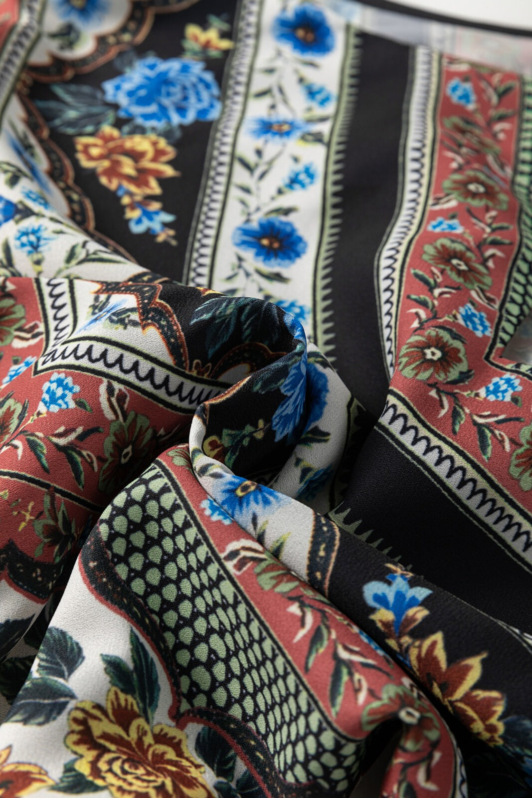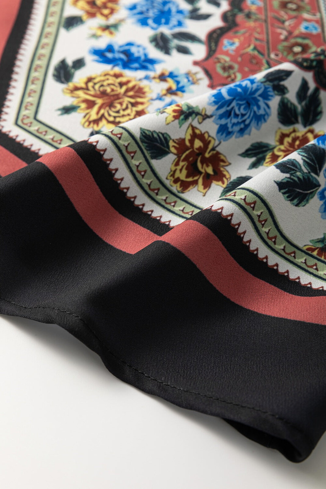 Handkerchief hemlines - it's like wearing a little party on your torso, really. The Botanical Harmony top delivers that delight in a way that's equal parts bohemian and cosmopolitan chic. That kind of fusion makes you think you could wear this out for a girl's brunch, or for shopping at the mall, and maybe even at work if the dress code isn't too stuffy. The material has a beautiful sheen, which is nice because it plays off the intricacy of the prints and elevates the overall look. The V-neck paired with adjustable thin straps gives it that universally flattering form - don't even get started on how it adds length to the neck. It’s got this touch of daring but also feels very comfortable to wear with its soft touch and easy fit. There’s a richness in the detailed prints that can be described as ornate. And, somehow there’s an air of luxury about it too with those delicate patterns and ornate borders.