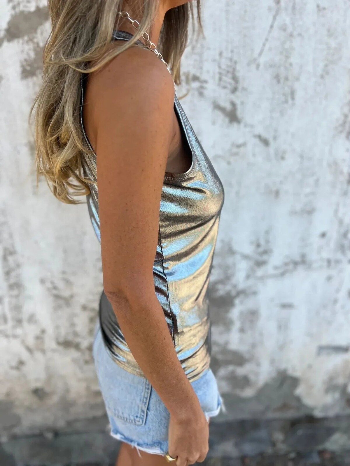 And the real magic here? Not just the futuristic shine (though, honestly, that’s a major win). It’s how this top serves every body type without fuss. Pair it with glittering platforms and wide-leg trousers or keep it casual with distressed shorts and slides. This is one of those rare tanks that holds its own solo but also teams perfectly with blazers for a night out or weekends when you want to channel a bit of futuristic glamour. There’s an edge to it - very now, very easy, very out-of-this-world.
