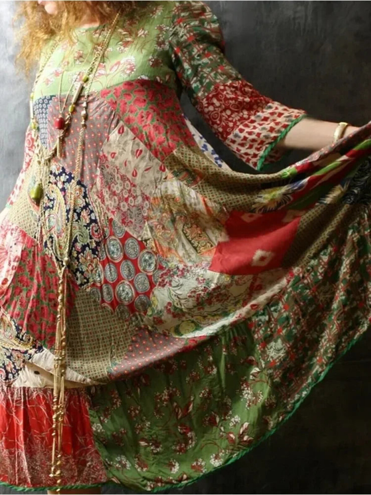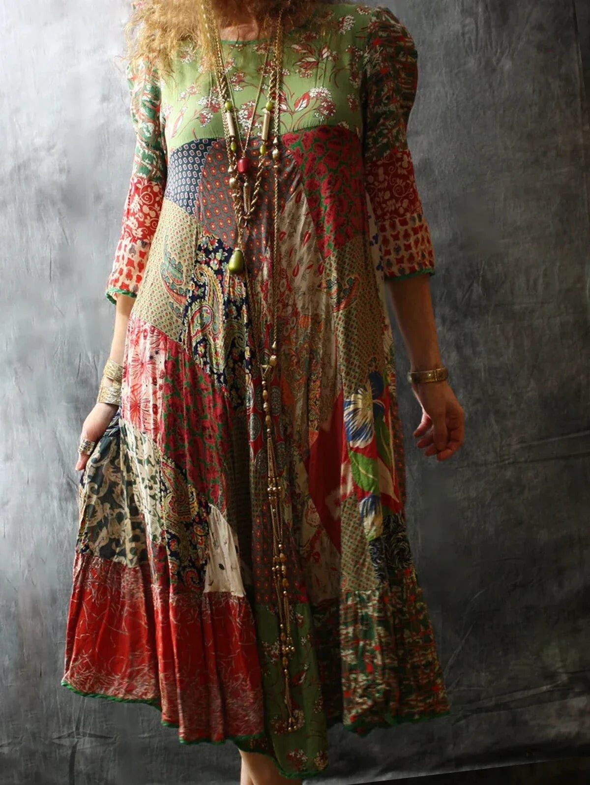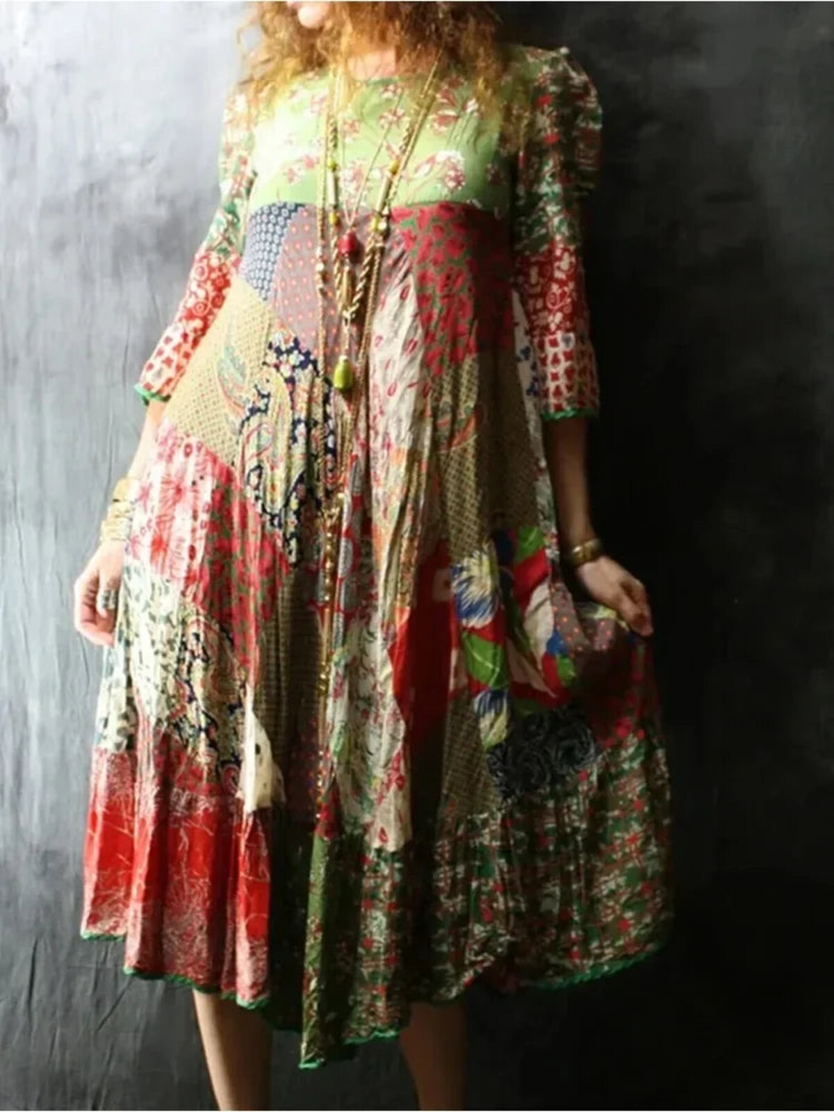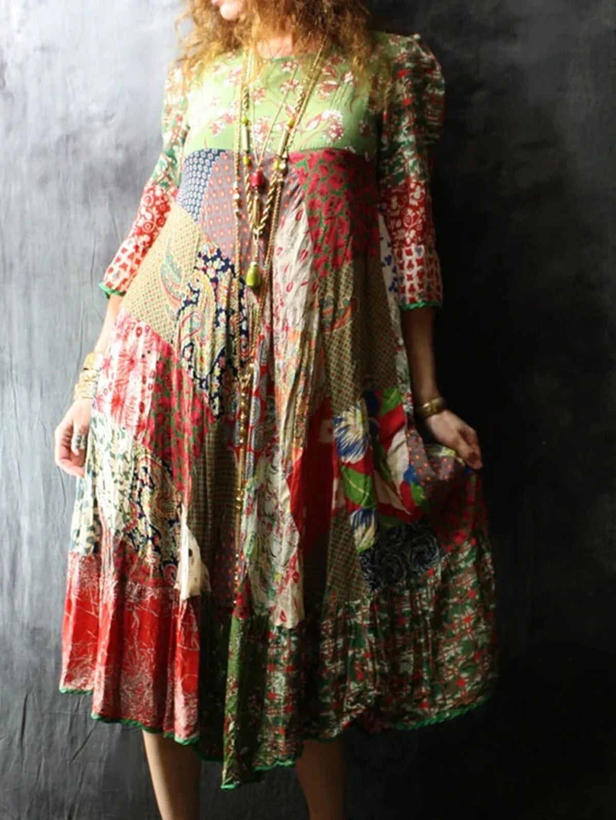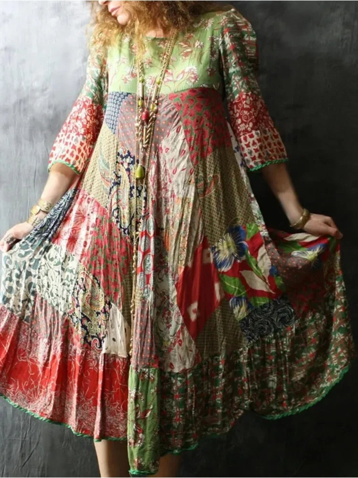 Patchwork dresses can be a bit like those make-your-own adventure books from the 80s - you’re never quite sure what you’re going to get, but that’s half the fun. This one doesn’t disappoint. It’s not so much a dress as a multi-colour conversation starter - equal parts art piece and antidote to fast fashion’s beige parade. Crafted from patchwork squares with no two alike, this midi dress is an ode to self-expression. Dramatic? Maybe. But you won’t care about drama when your arms are swishing through those loose 3/4 sleeves and the hem’s spinning around your ankles in what can only be described as “a vibe”. There’s a kind of casual confidence about it all - it refuses to define the waist, and says ‘no thanks’ to lining or structure. You throw it on with accessories if you want, or let it speak for itself (let’s face it, this thing SHOUTS). O-neck means no fuss or faffing about zips, and the hemline says yes please to comfort for any age or season. A dress like this makes me want to cancel my plans just so I can wear it more often - but wouldn’t that defeat the purpose?