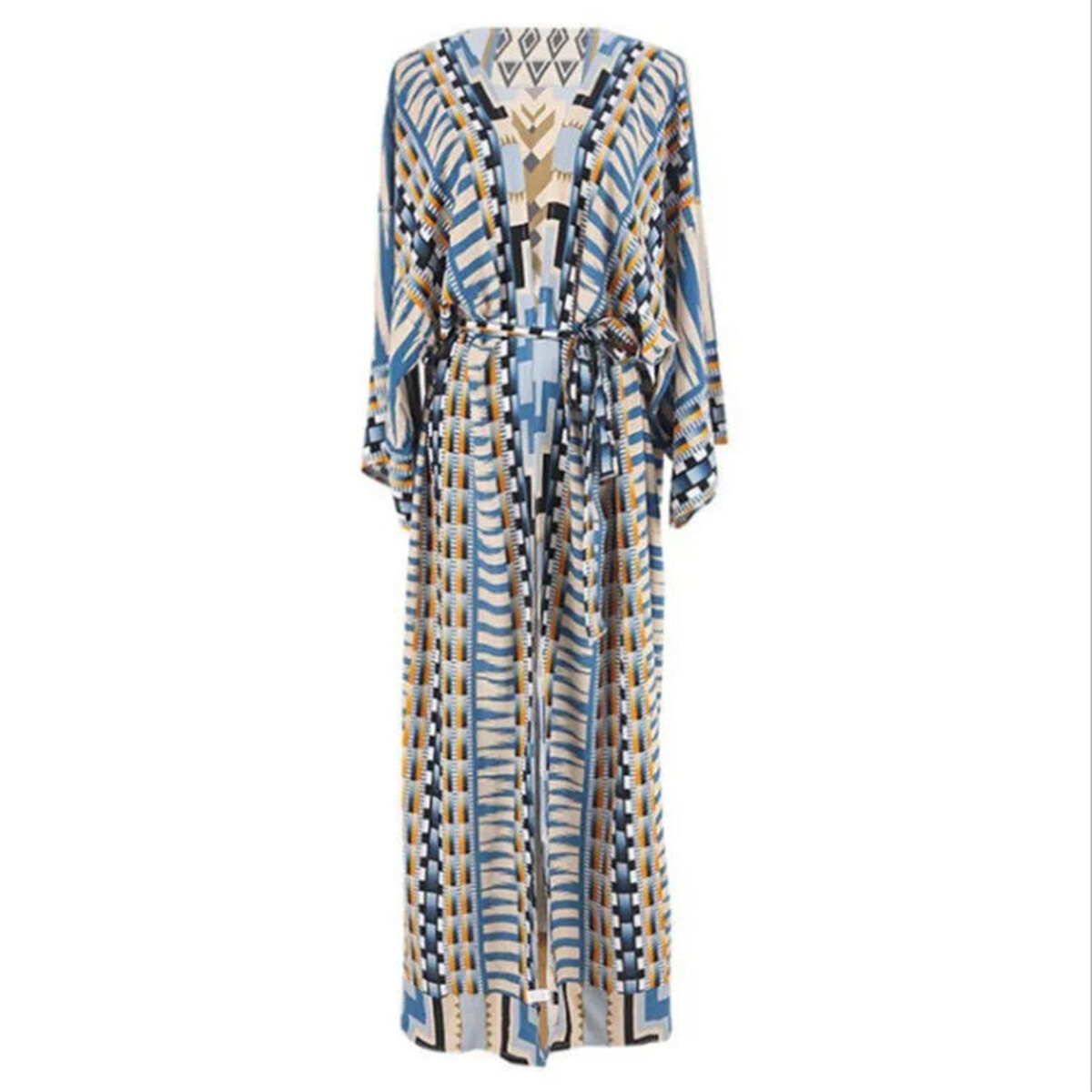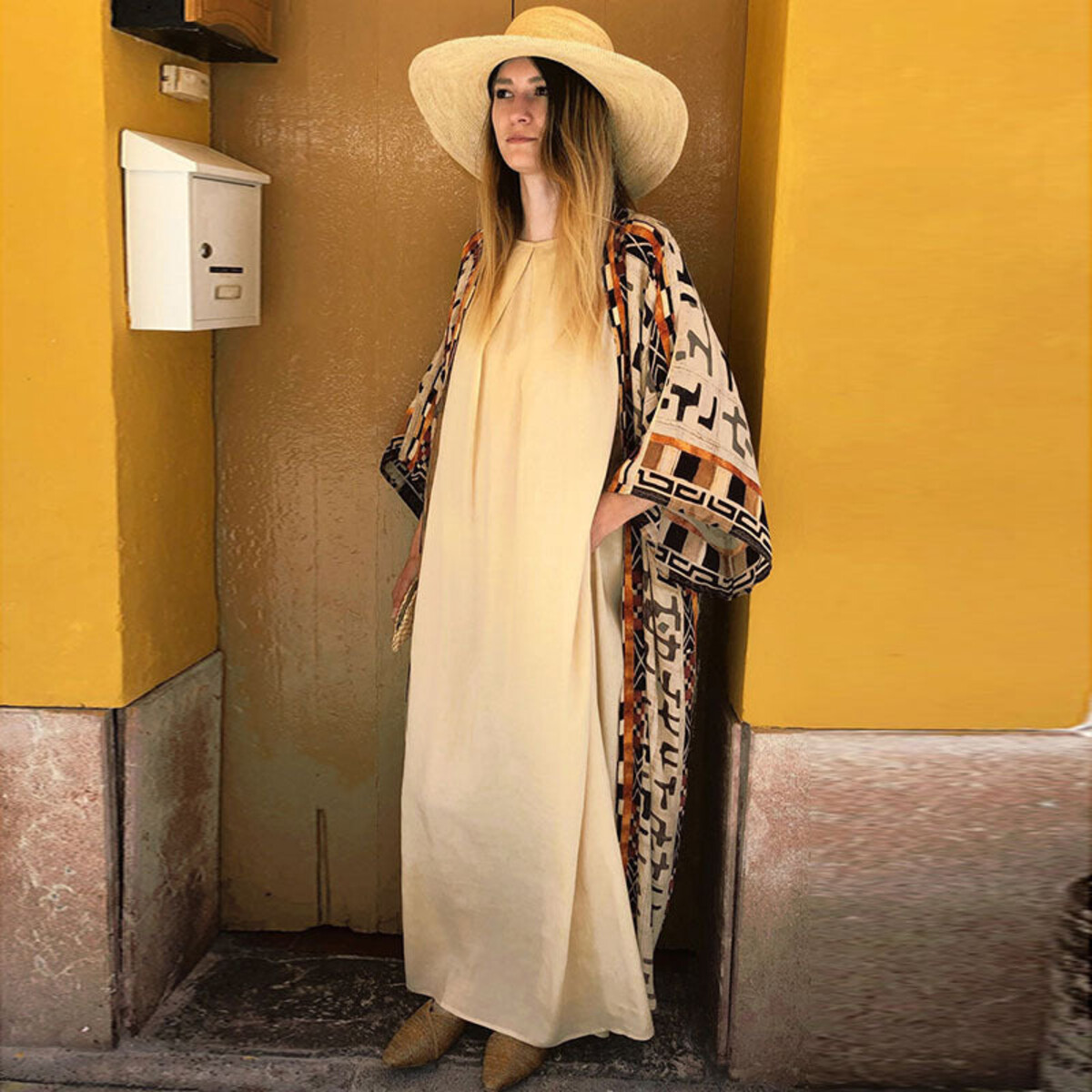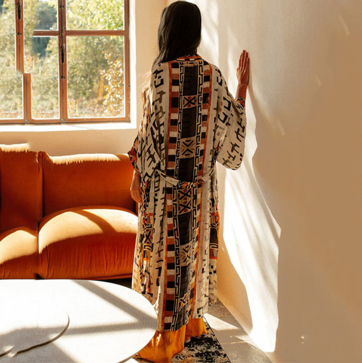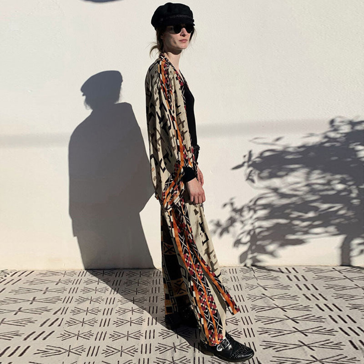 This robe’s like the holiday you keep threatening to take but never do. Big, breezy, and generously cut, it’s got ‘permanently out-of-office’ stitched right into the seams. It’s relaxed by design and looks fabulous whether you’re sashaying poolside, popping out for wine and groceries, or even unwashed on your third episode of Dateline in a row. The open-front cut says ‘I have nothing to hide’, but the tie belt offers a bit of mystery - wear it loose for an insouciant silhouette or knot it up and actually see your feet (your call). Let’s talk prints - there are jaw-dropping hand-drawn patterns from centre stripe to cuffed sleeve - tribal, bohemian, artfully crafted, artisan: you name it. Each one has a distinctly wanderlust vibe and is colour-rich - think ethnic geometrics, diamonds, chevrons, blocks. The lightweight fabric is soft with a gentle sheen that feels billowy and expensive but wears like pyjamas. A total dream robe that checks all boxes: flattering, forgiving fit with maximum coverage; breathable even in high heat; dramatic without being try-hard; printed like an artwork for collectors.