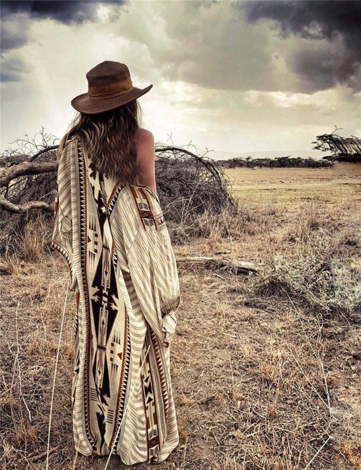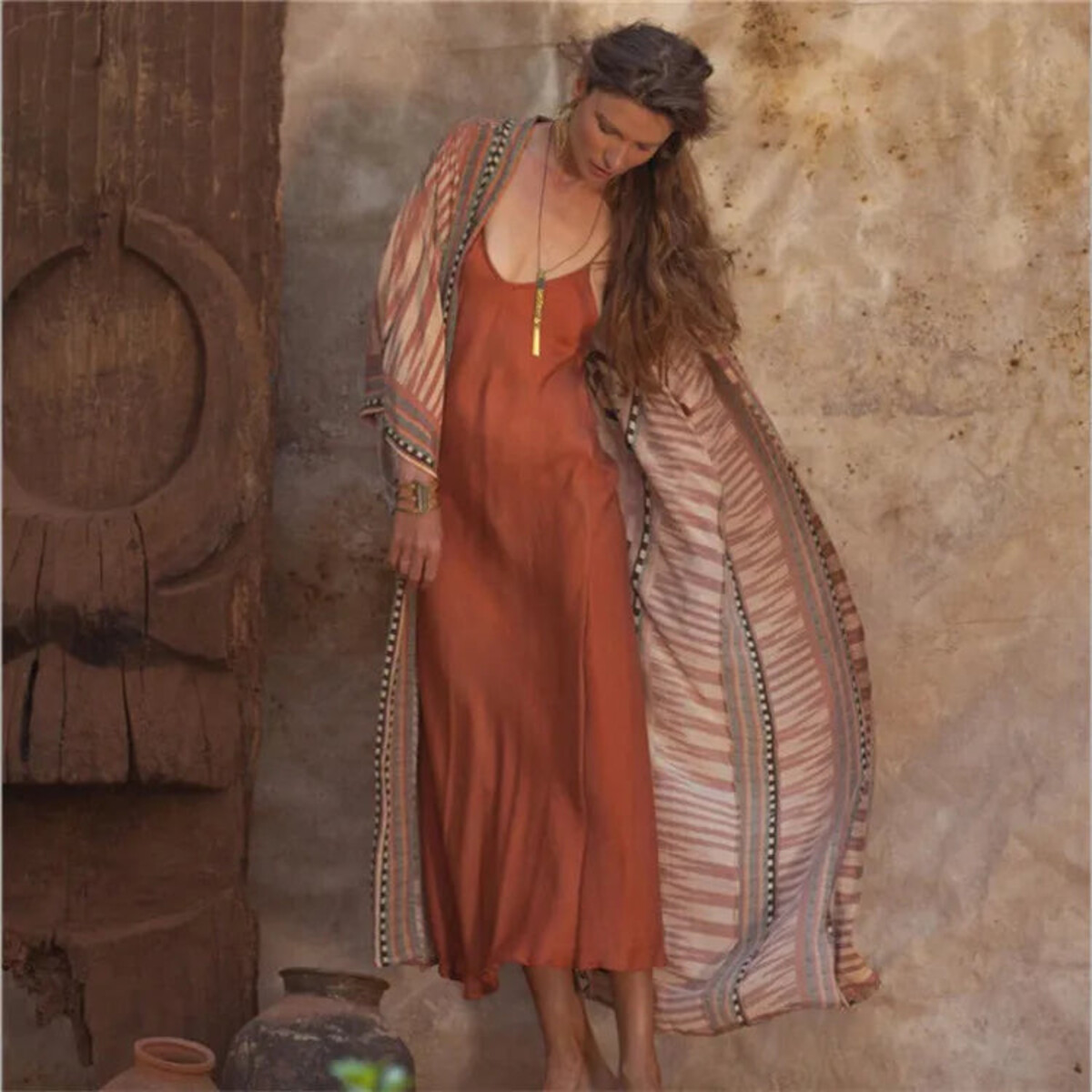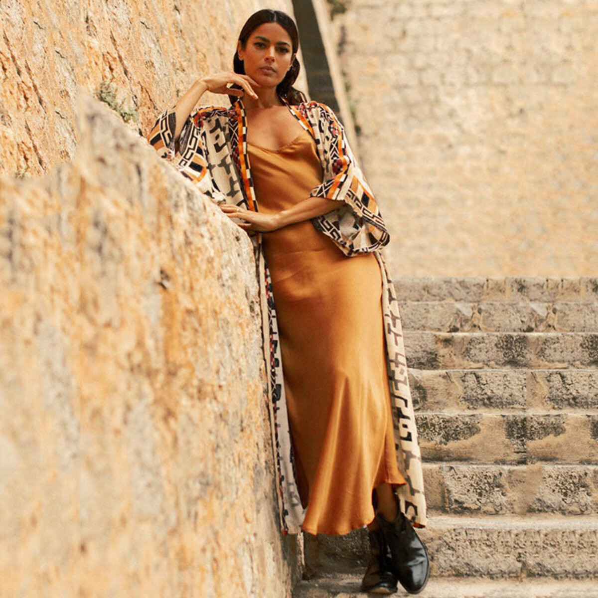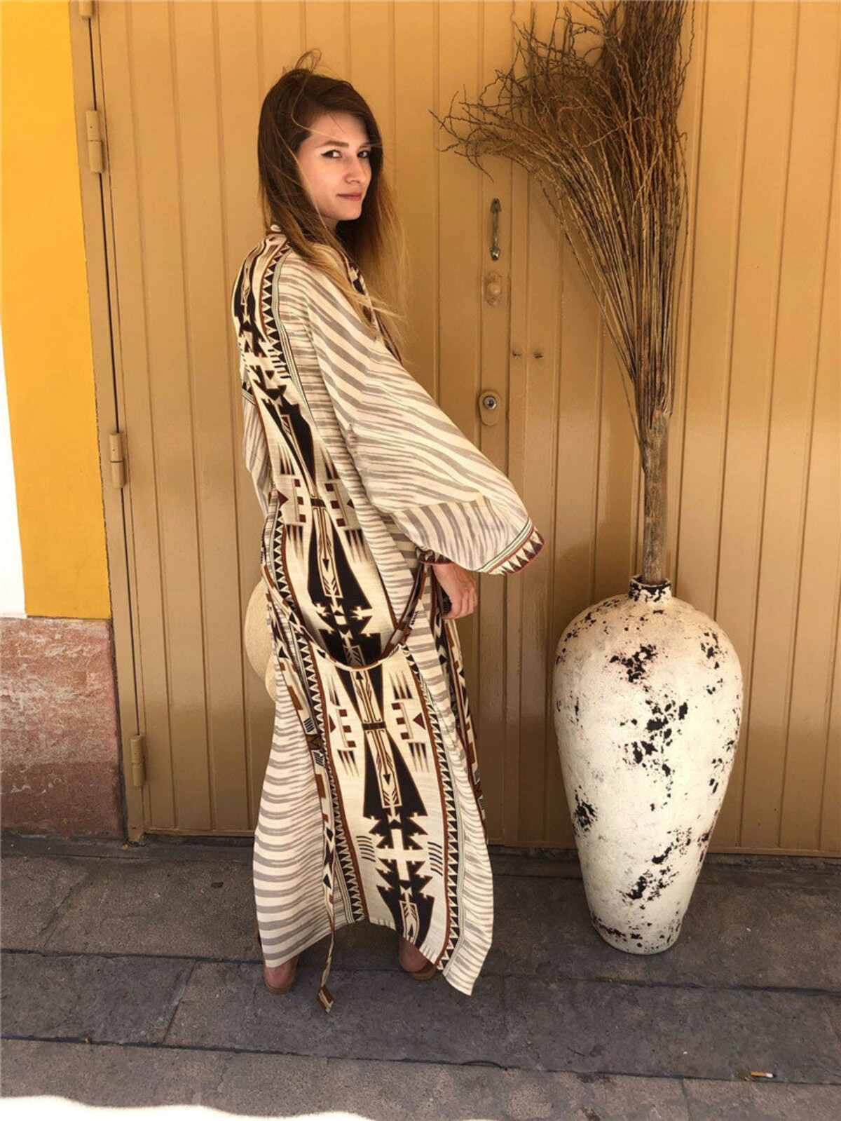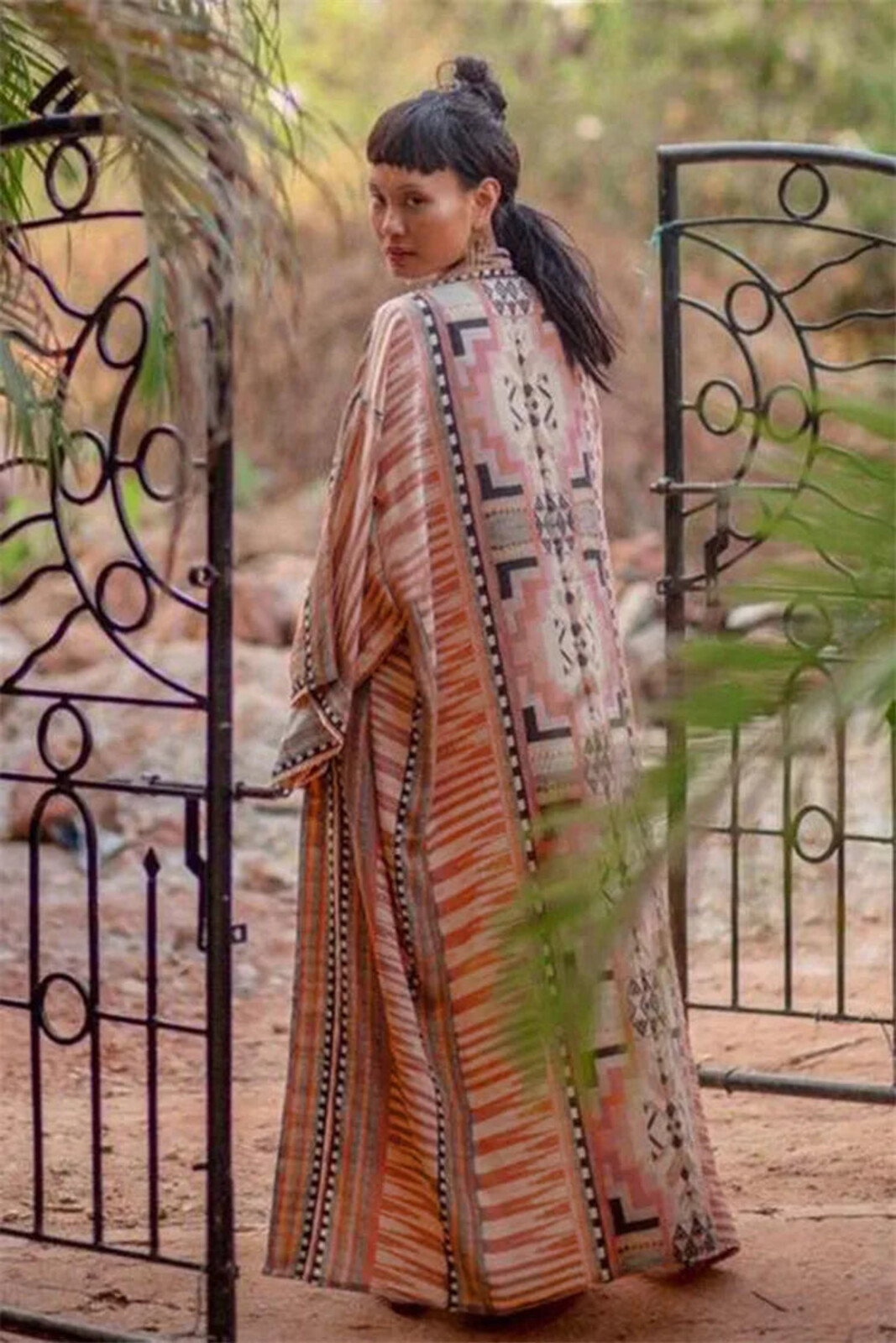 This robe’s like the holiday you keep threatening to take but never do. Big, breezy, and generously cut, it’s got ‘permanently out-of-office’ stitched right into the seams. It’s relaxed by design and looks fabulous whether you’re sashaying poolside, popping out for wine and groceries, or even unwashed on your third episode of Dateline in a row. The open-front cut says ‘I have nothing to hide’, but the tie belt offers a bit of mystery - wear it loose for an insouciant silhouette or knot it up and actually see your feet (your call). Let’s talk prints - there are jaw-dropping hand-drawn patterns from centre stripe to cuffed sleeve - tribal, bohemian, artfully crafted, artisan: you name it. Each one has a distinctly wanderlust vibe and is colour-rich - think ethnic geometrics, diamonds, chevrons, blocks. The lightweight fabric is soft with a gentle sheen that feels billowy and expensive but wears like pyjamas. A total dream robe that checks all boxes: flattering, forgiving fit with maximum coverage; breathable even in high heat; dramatic without being try-hard; printed like an artwork for collectors.