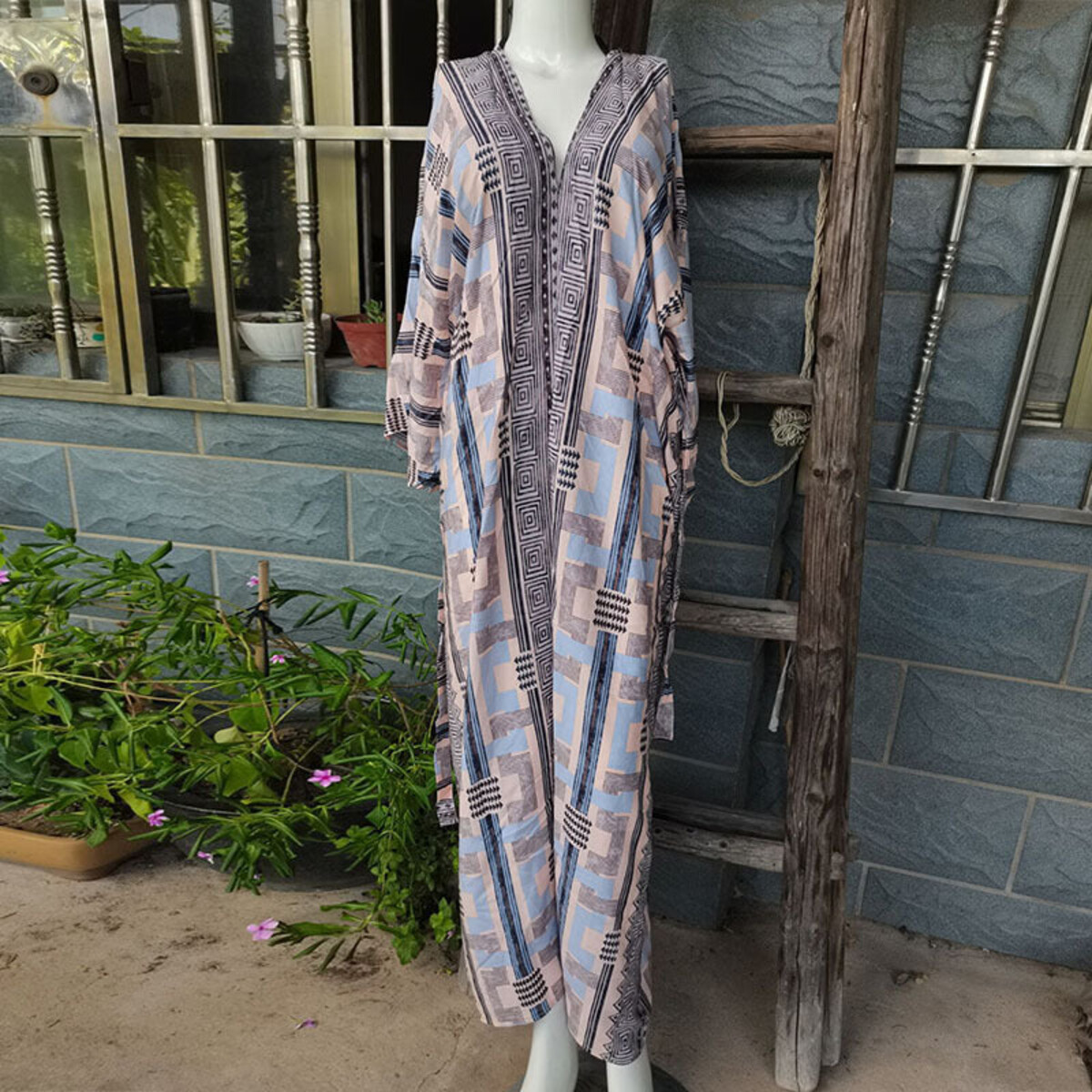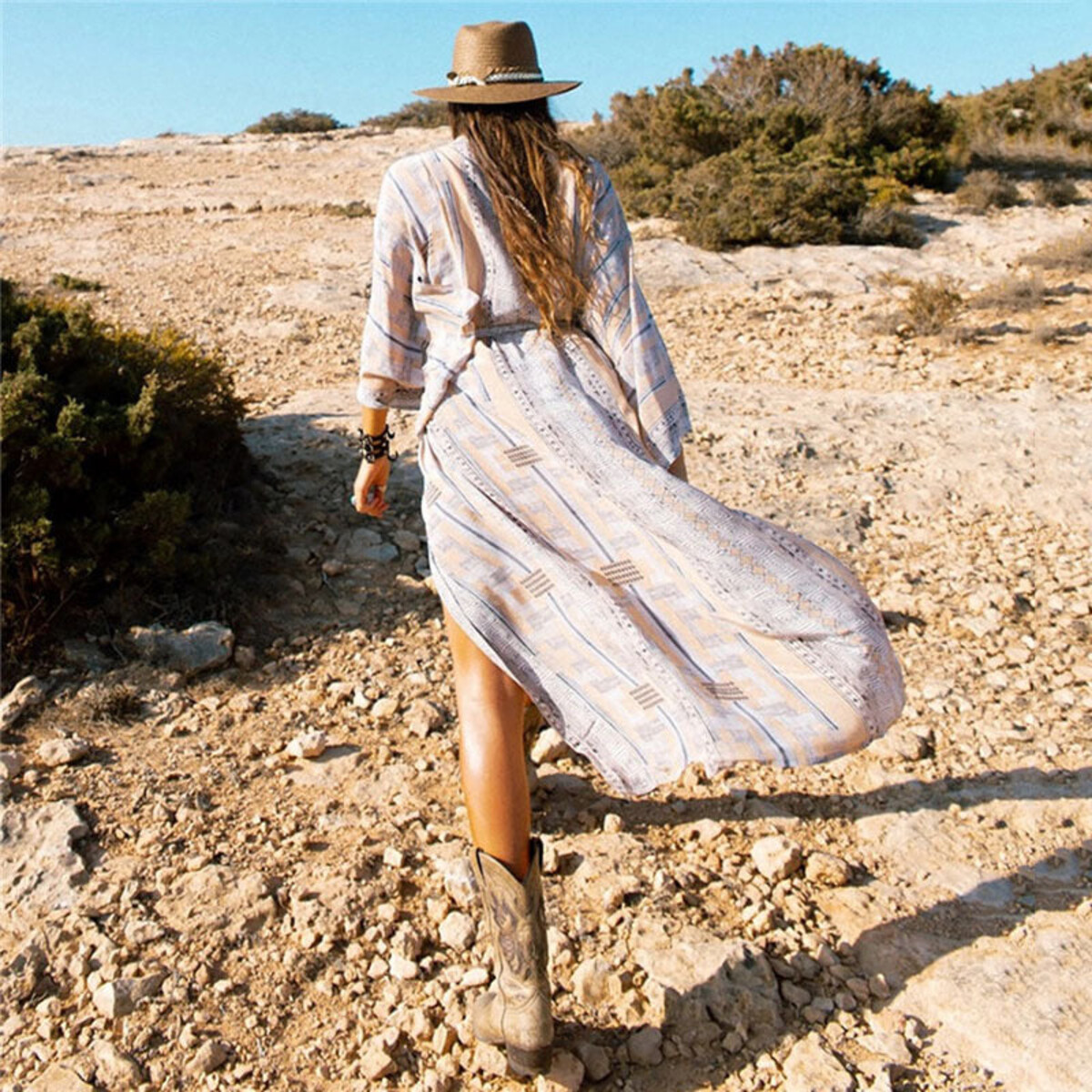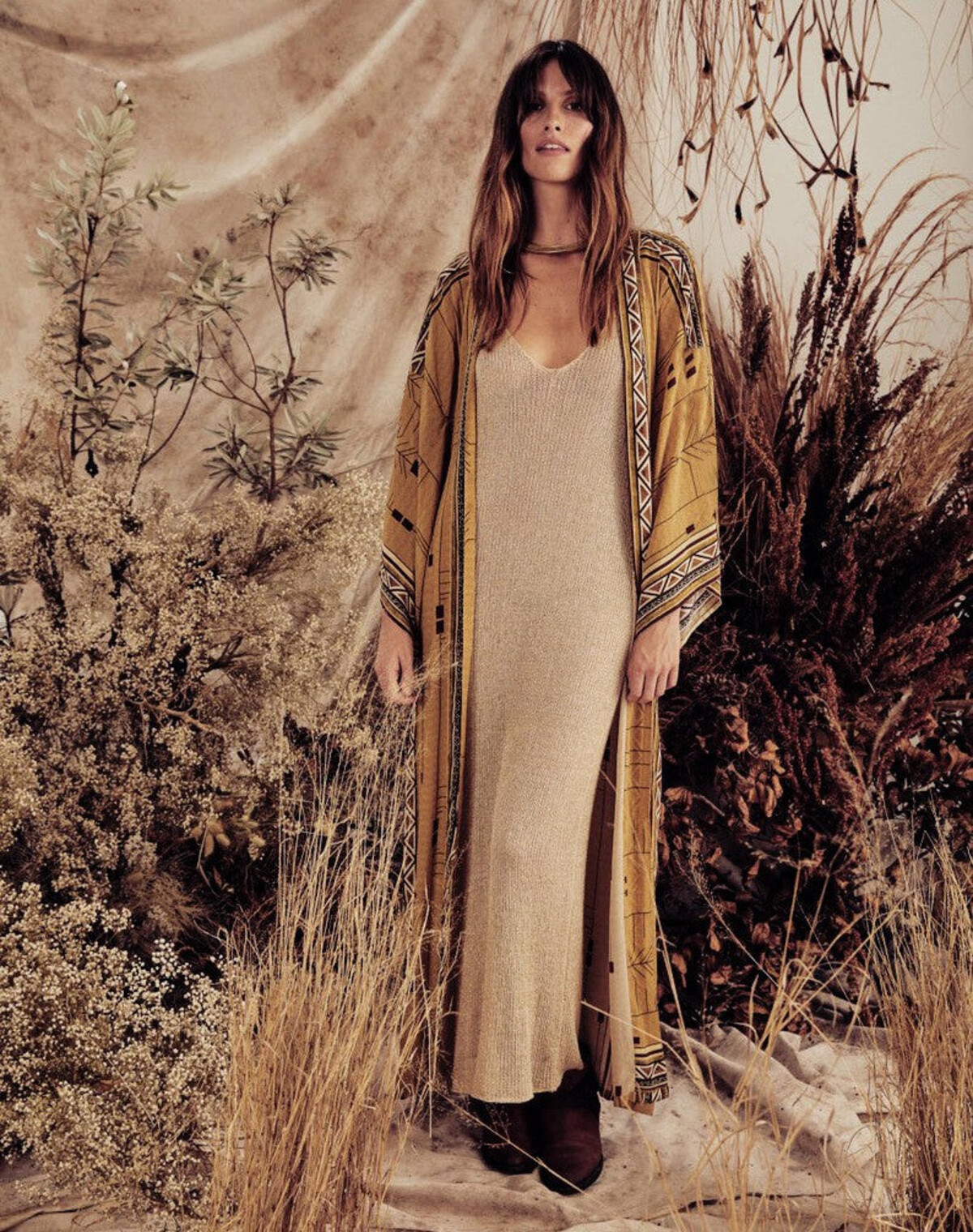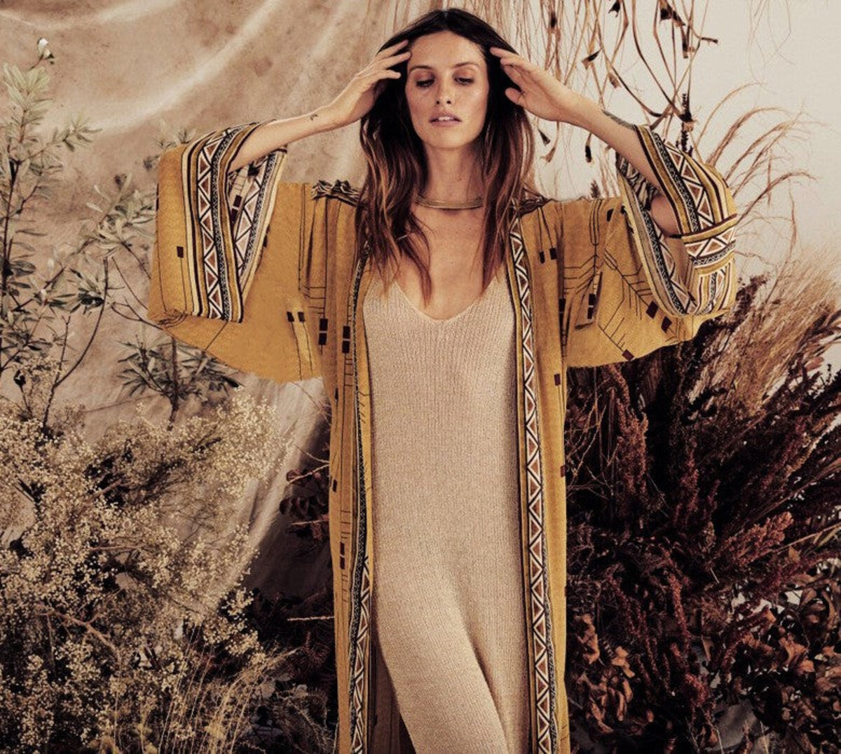 This robe’s like the holiday you keep threatening to take but never do. Big, breezy, and generously cut, it’s got ‘permanently out-of-office’ stitched right into the seams. It’s relaxed by design and looks fabulous whether you’re sashaying poolside, popping out for wine and groceries, or even unwashed on your third episode of Dateline in a row. The open-front cut says ‘I have nothing to hide’, but the tie belt offers a bit of mystery - wear it loose for an insouciant silhouette or knot it up and actually see your feet (your call). Let’s talk prints - there are jaw-dropping hand-drawn patterns from centre stripe to cuffed sleeve - tribal, bohemian, artfully crafted, artisan: you name it. Each one has a distinctly wanderlust vibe and is colour-rich - think ethnic geometrics, diamonds, chevrons, blocks. The lightweight fabric is soft with a gentle sheen that feels billowy and expensive but wears like pyjamas. A total dream robe that checks all boxes: flattering, forgiving fit with maximum coverage; breathable even in high heat; dramatic without being try-hard; printed like an artwork for collectors.