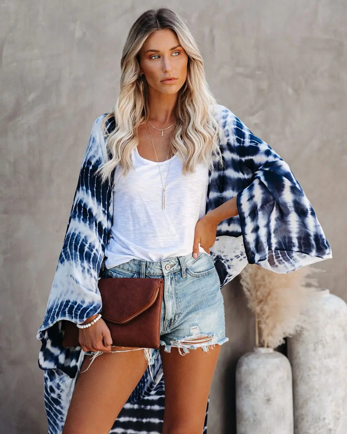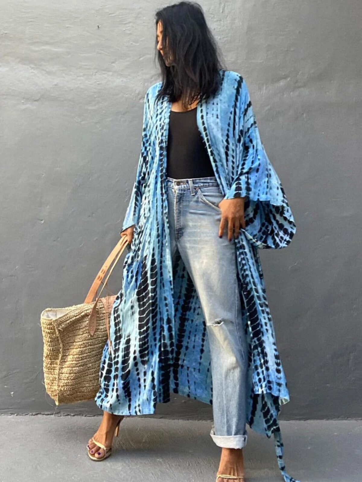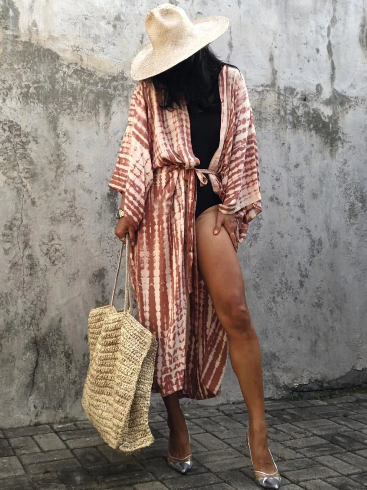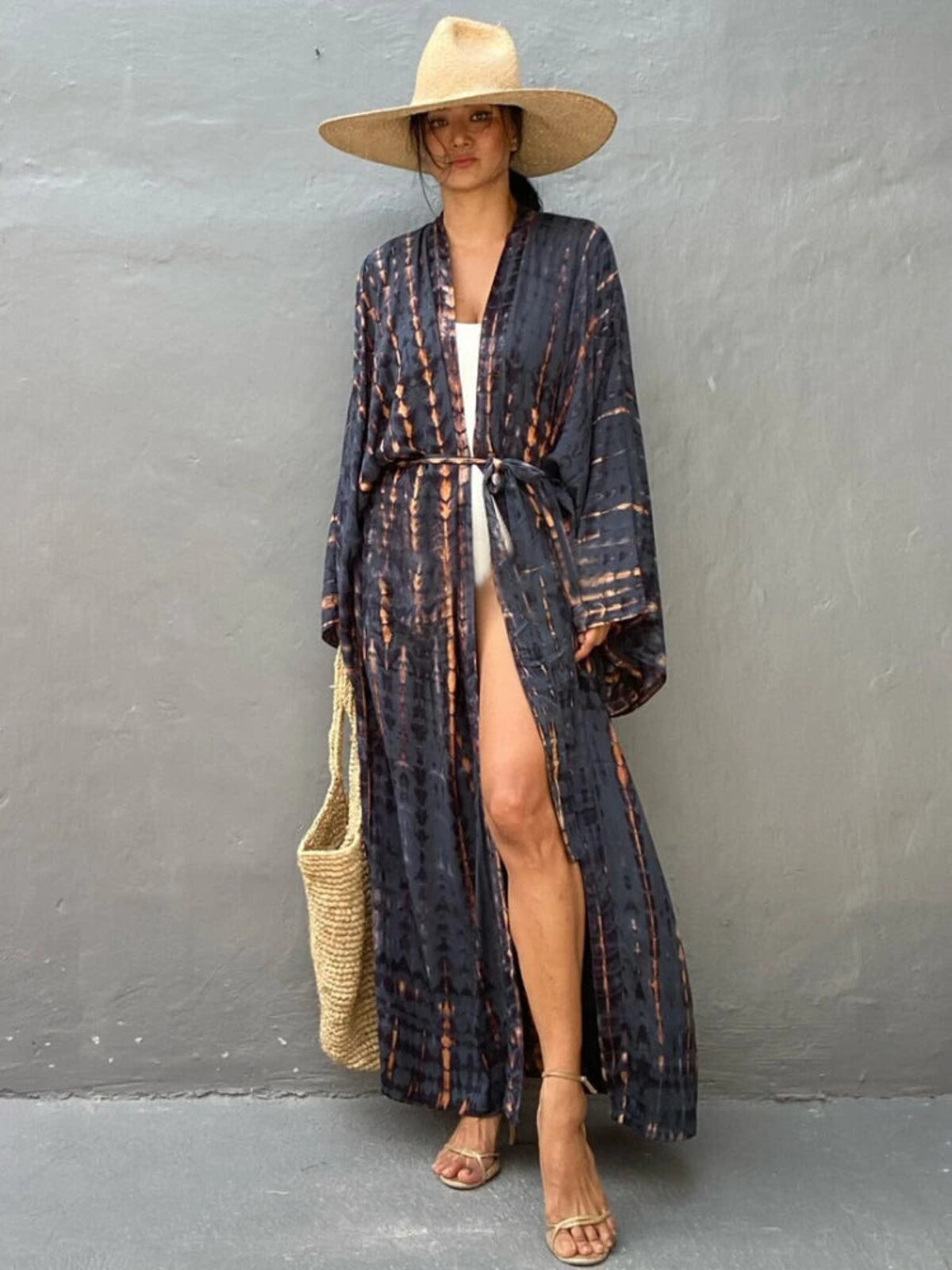 If ever there were a dramatic entry for the poolside crowd, this is it. And let’s face it, nothing says ‘laid-back luxury’ quite like billowing in with your kimono-style duster swirling behind you and a broad sash tie to cinch it all in - or not, because sometimes the body just wants to breathe. The oversized, fluid cut of this number makes it a real shapeshifter: drape it loose for maximum breeze or belt up when you’re ready to channel some serious elegance. And those wide sleeves? Beyond glamorous with just enough drama for an impromptu cocktail run.