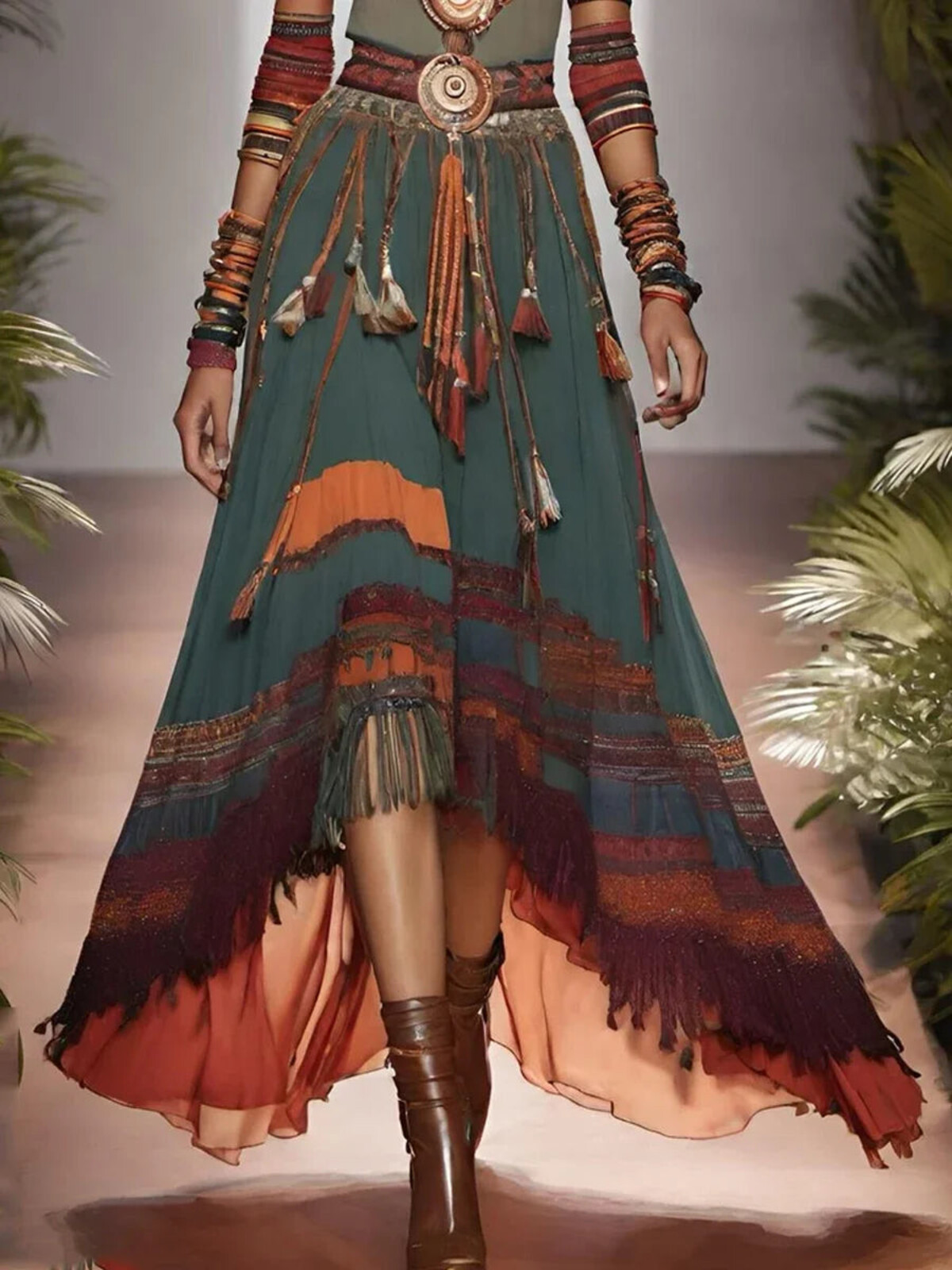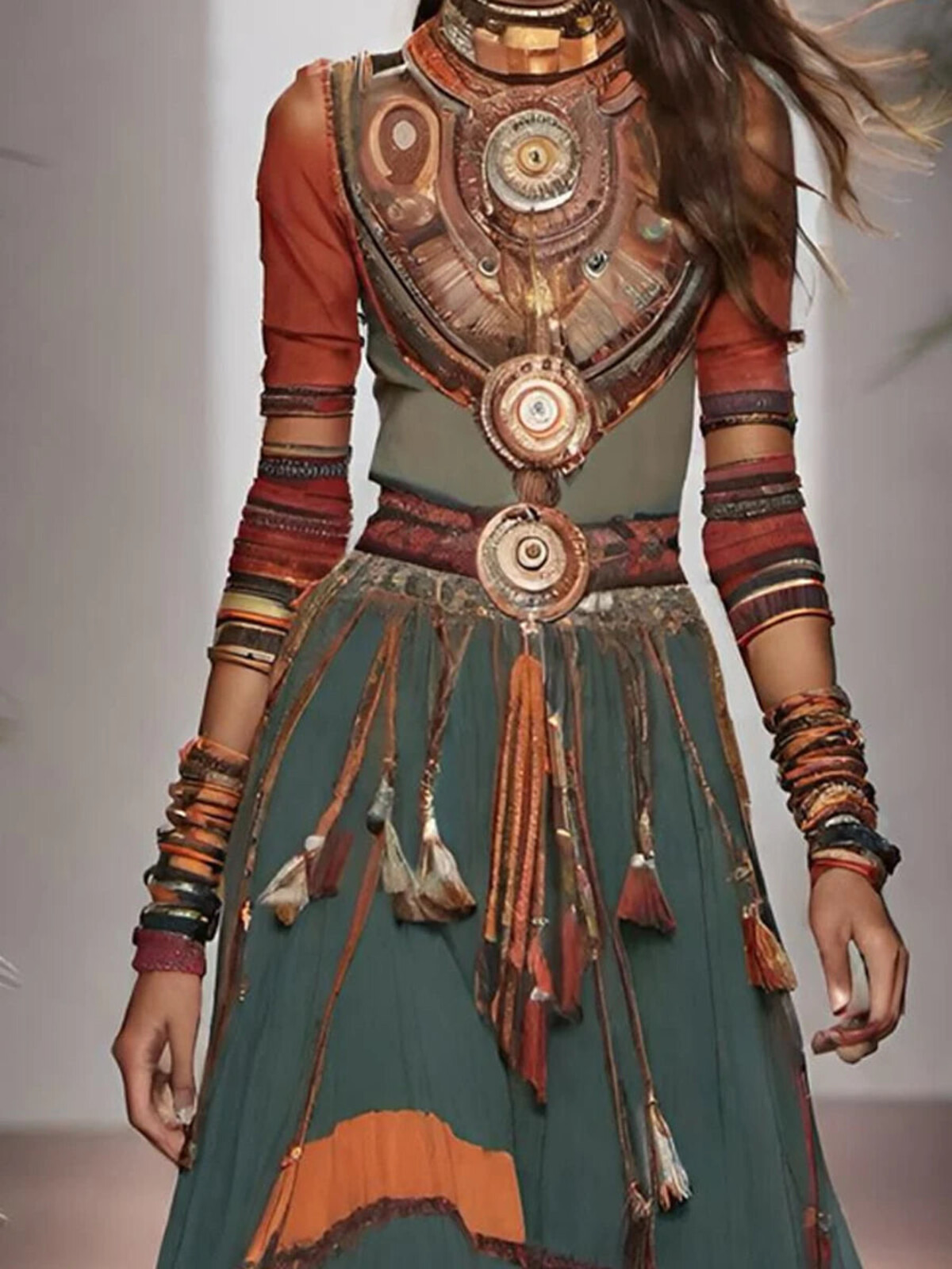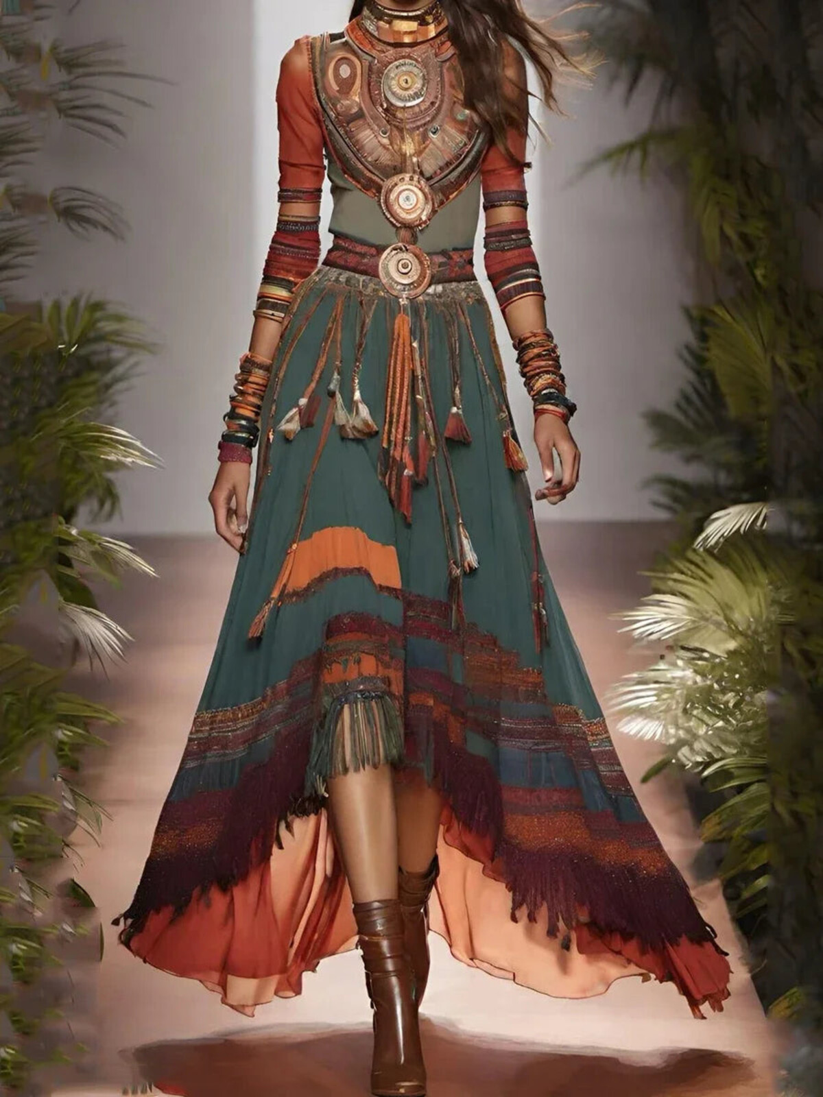 Some boho dresses are all tassels and no trousers. But not this one - the Enchanted Voyage dress is couture meets artisan, tribal meets festival, with a touch of Autumn at an ancient solstice fire thrown in. The cut is what you notice first - the bold high-low hem shows off any shoes you choose while flattering any height. The fit is nipped at the waist, with a fullness in the skirt that manages to be both regal and untamed. And then there’s the detail. The embroidery, stitched bands, fringing, beadwork, all add texture and an air of heritage weaving. The interplay of rich jewel-tone panels makes it more complex than your average runway frock - and it’s got weight thanks to its woven trim and layered construction. Up close? Shimmering medallions, clever ruching on sleeves, scattered metallic beading on bodice. Pull it on for dinner parties that become moonlit dancing or day events that end in eclectic conversations by candlelight.