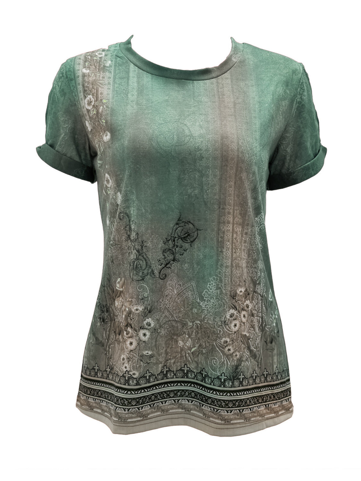 This shirt mixes soft, faded drama with an arty, bohemian edge. And yes, you can be both artistic and a bit of a drama queen - which this shirt doesn’t shy away from. The front? A diagonal cascade of dreamy vintage florals moves across the bust and onto your right hip, all against an ornate baroque-inspired backdrop that looks like it was plucked from some grand Parisian hotel lobby. The sleeves are interesting without being over-the-top: a proper cut-out tied up at the shoulder, giving off a bit of chic, Greek goddess energy (you know - if the ancient Greeks had Netflix).