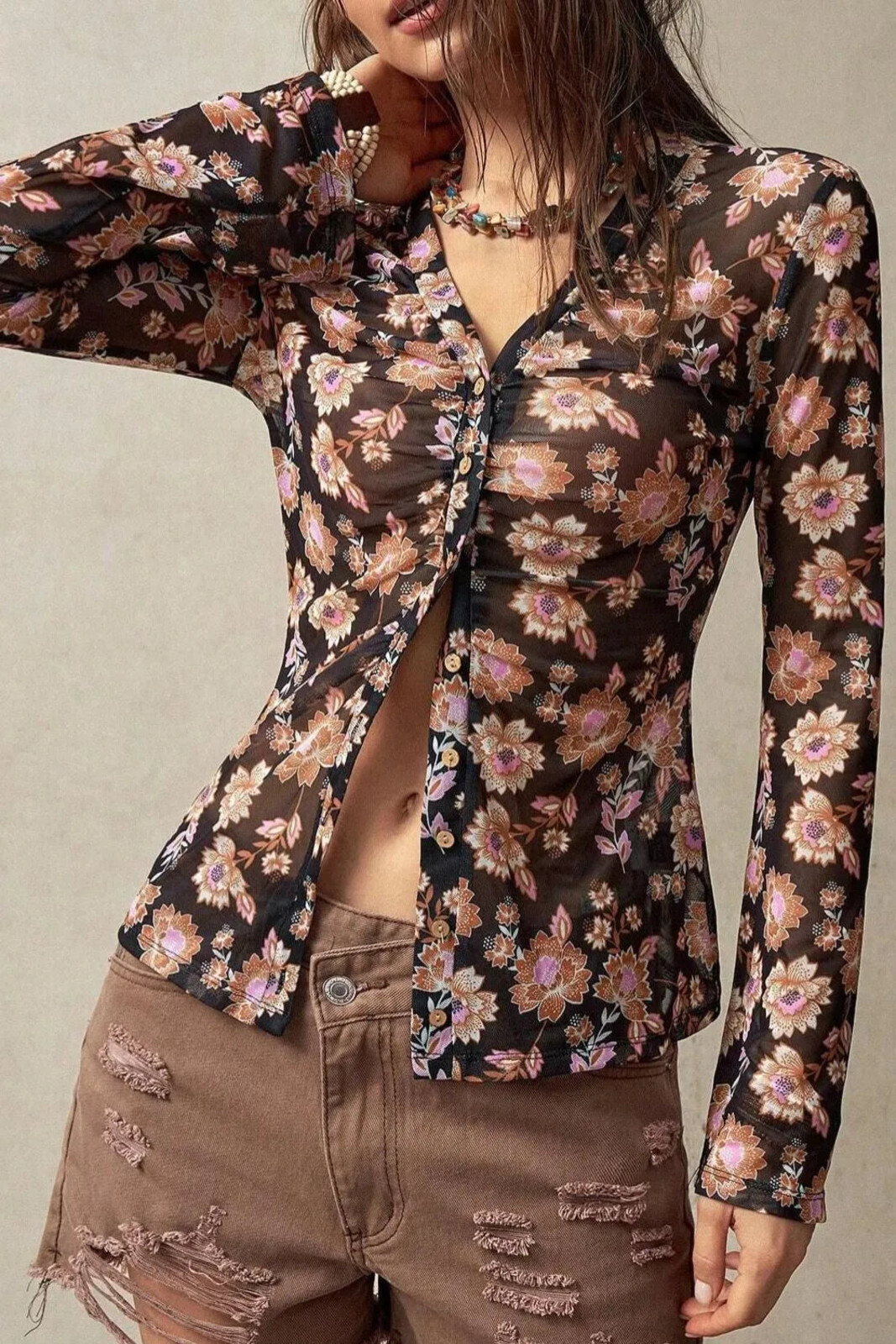 Take this romantic ruched mesh top for example - it’s floral, fitted and oh-so-stylish with its v-neck and button-down front. The mesh fabric is slightly sheer but not enough that you’d feel exposed, especially with the concentrated floral print bringing texture and detail to the bust. Ruched seams add an illusion of a smaller waistline, while flared sleeves are perfect for skimming over your arms without drawing attention away from all the bits you want seen.
