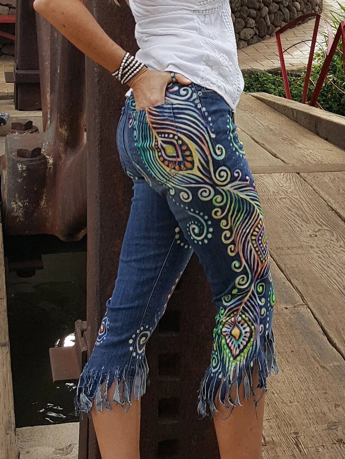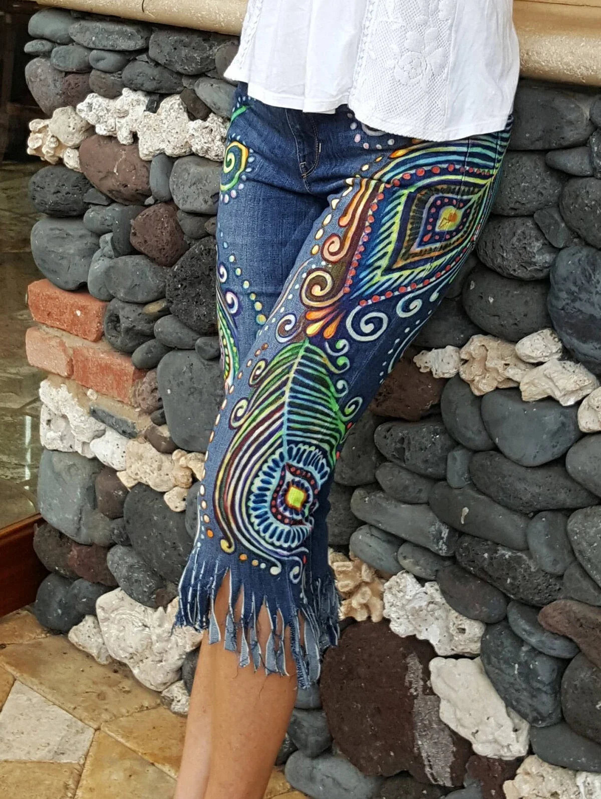 There are jeans, and then there are ‘steal the show at Sunday brunch’ jeans. These ones - this kaleidoscopic, boho-cool denim take the cake. Imagine stumbling out of a music festival at sunrise, but being on your way to work instead. Painted in every shade under the sun by actual hands - yes, a human was involved here - these jeans are wearable art that make everything else you own look rather beige (no judgement). Groovy peacock-like swirls, mandala vibes, all punctuated with a scattering of musical notes for those who can’t help but tap a toe.