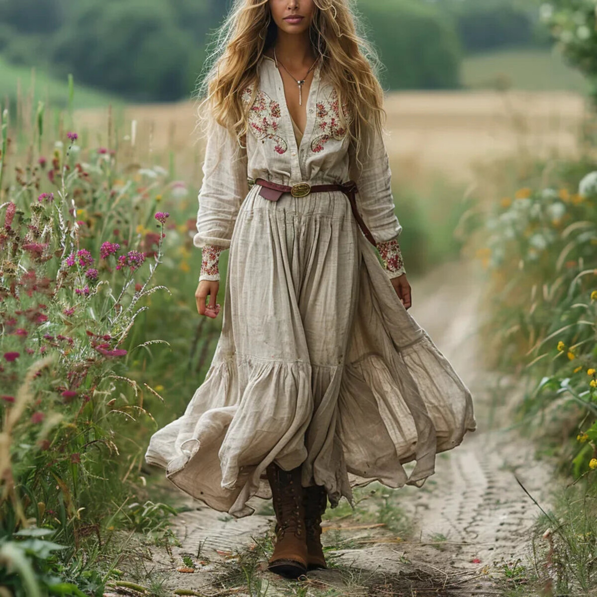 Wafting through the crowd with all the confidence of a woman who’s just learned that Pinot Noir is good for her heart, this long-sleeved maxi brings out the flower child in all of us. The fabric? Light as gossip on a windy day and likely just as breathable. It drapes and moves - not so much like water, but like someone with somewhere to be and a fabulous playlist to get there. Embroidery dances across the chest and cuffs, a free-spirited salute to mornings spent daydreaming under clouds shaped suspiciously like second helpings. Those fabric-covered buttons down the front are as adorable as they are practical - always handy if you end up at a beach bonfire. There’s an elastic waistline that’s forgiving even after two helpings of sticky date pudding (not that anyone’s counting). A ruffled hem gives it all some ‘oomph’ when you’re gliding from yoga brunch to last orders at happy hour, or heading straight into another adventure altogether.