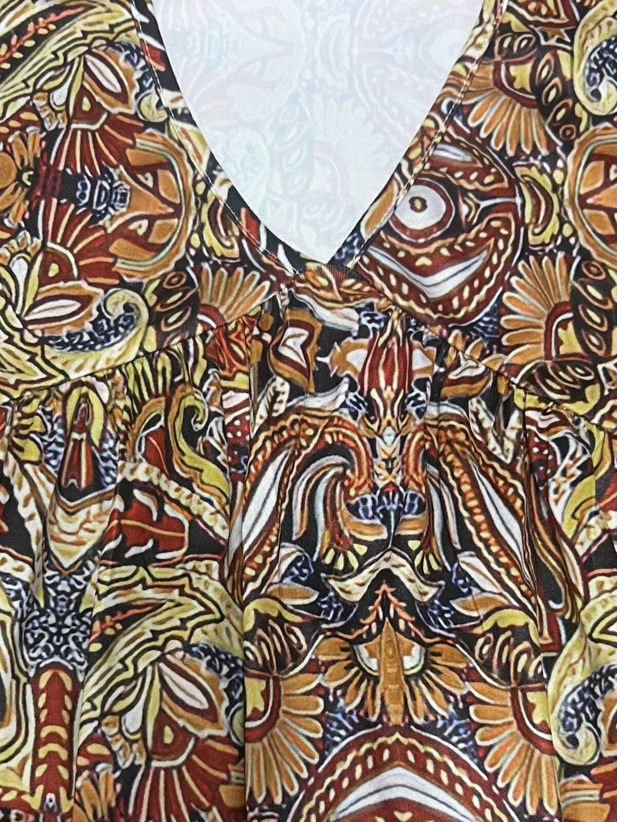 But back to design - the neckline dips into a wide V shape and is met by ruched pleating beneath the bust. This creates visual interest while drawing attention upward towards the face. There’s no stretch in this relaxed fit number but there really doesn’t need to be - there’s plenty of space for movement without feeling over-sized or awkwardly fitting.