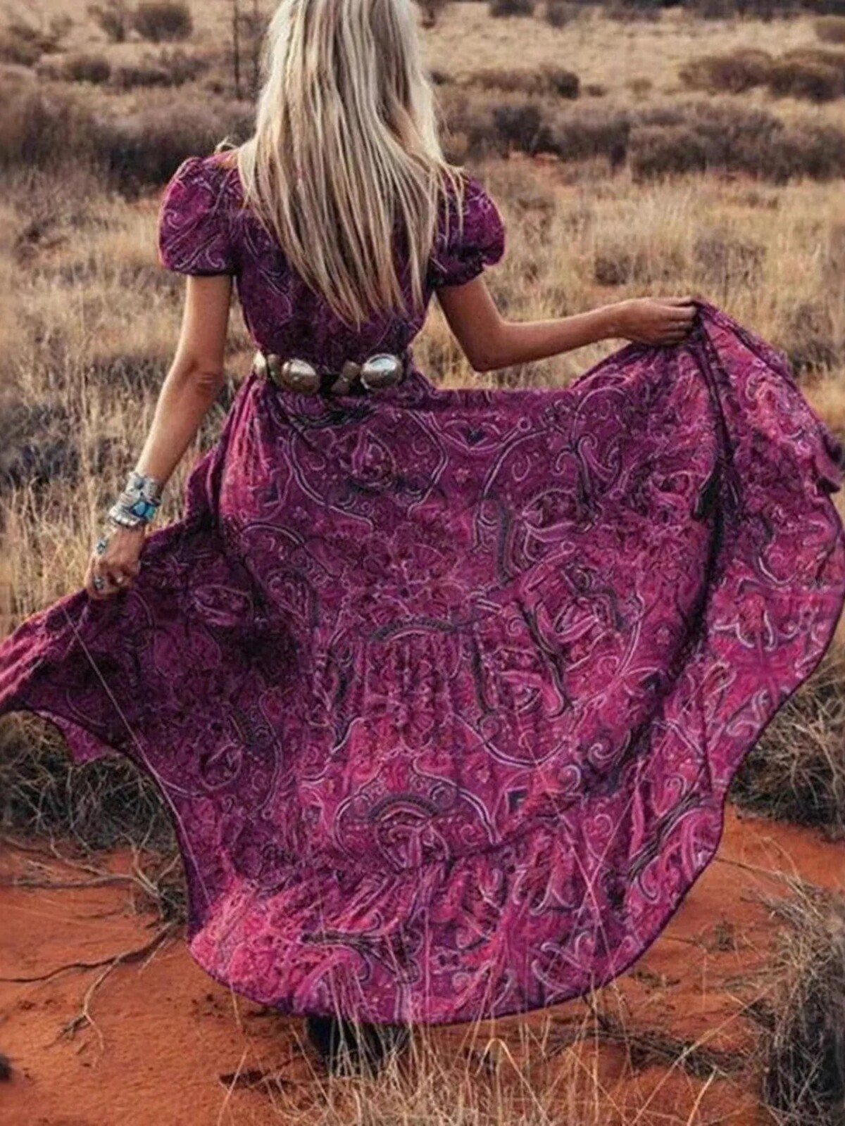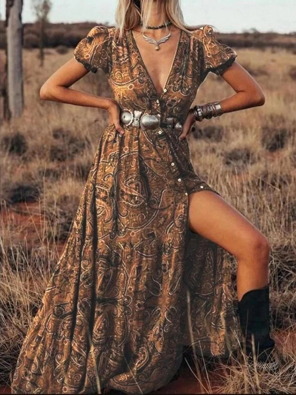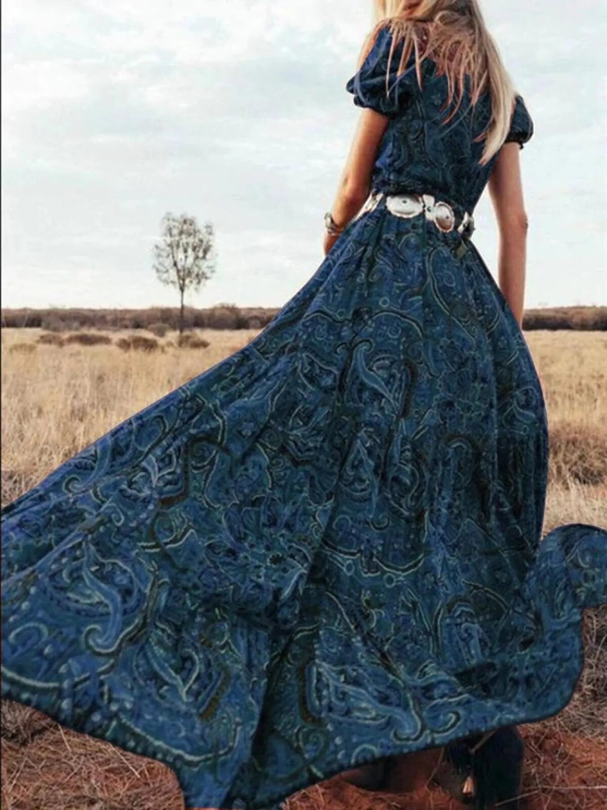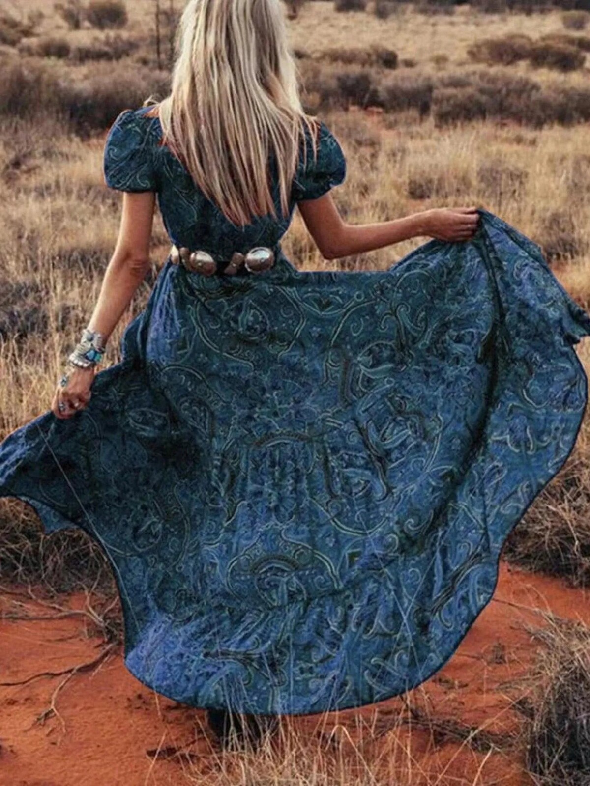 The swirling paisley print is intricate but not over-the-top. Perfect with cowboy boots or bare feet, depending on whether you’re heading to the local markets or waltzing across your living room. No stretch but plenty of comfort in its soft fabric - wear it out for fancy dinners or just a day outdoors… perhaps even an impromptu photo session in your backyard.