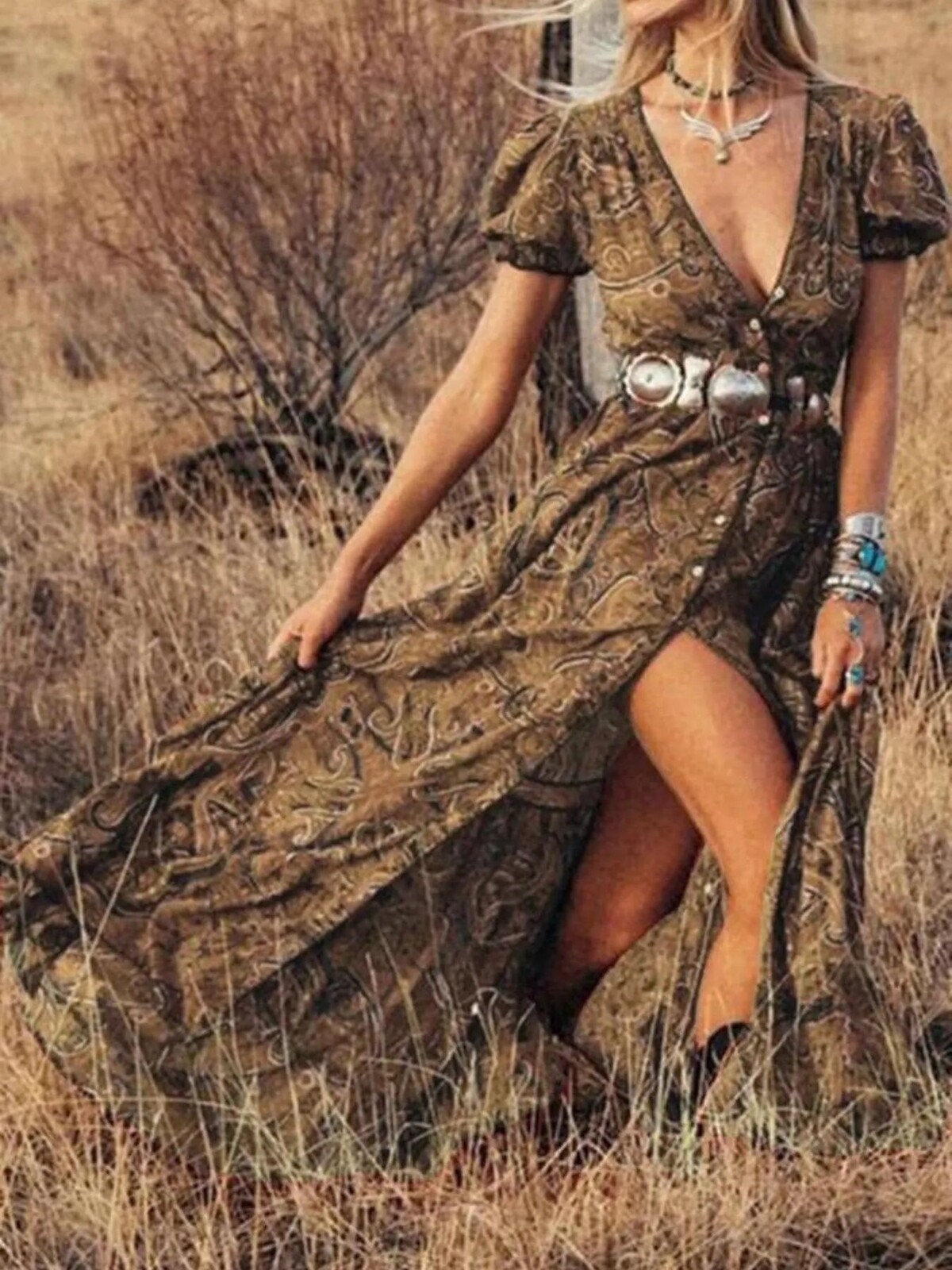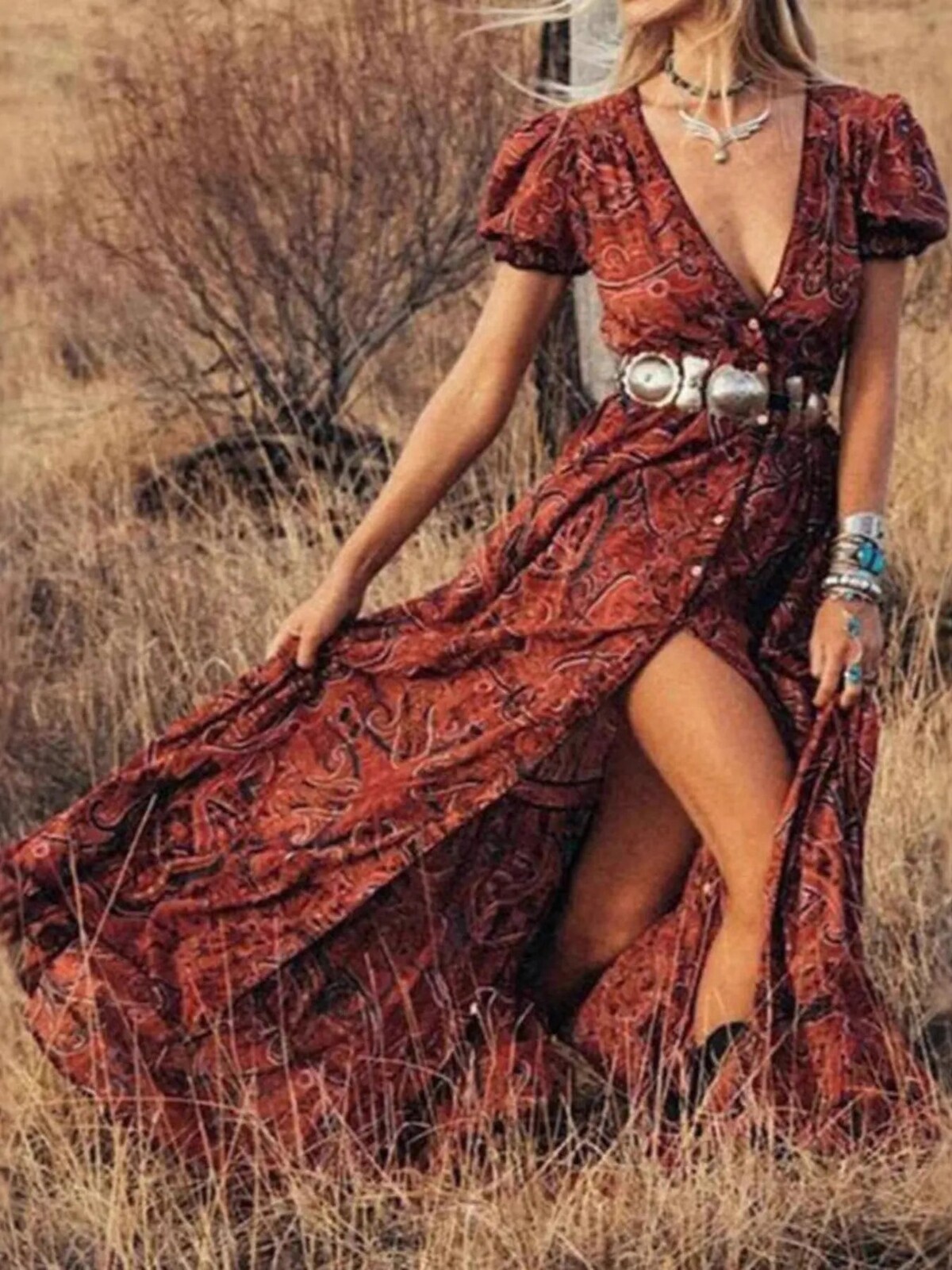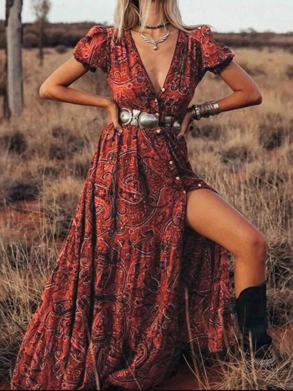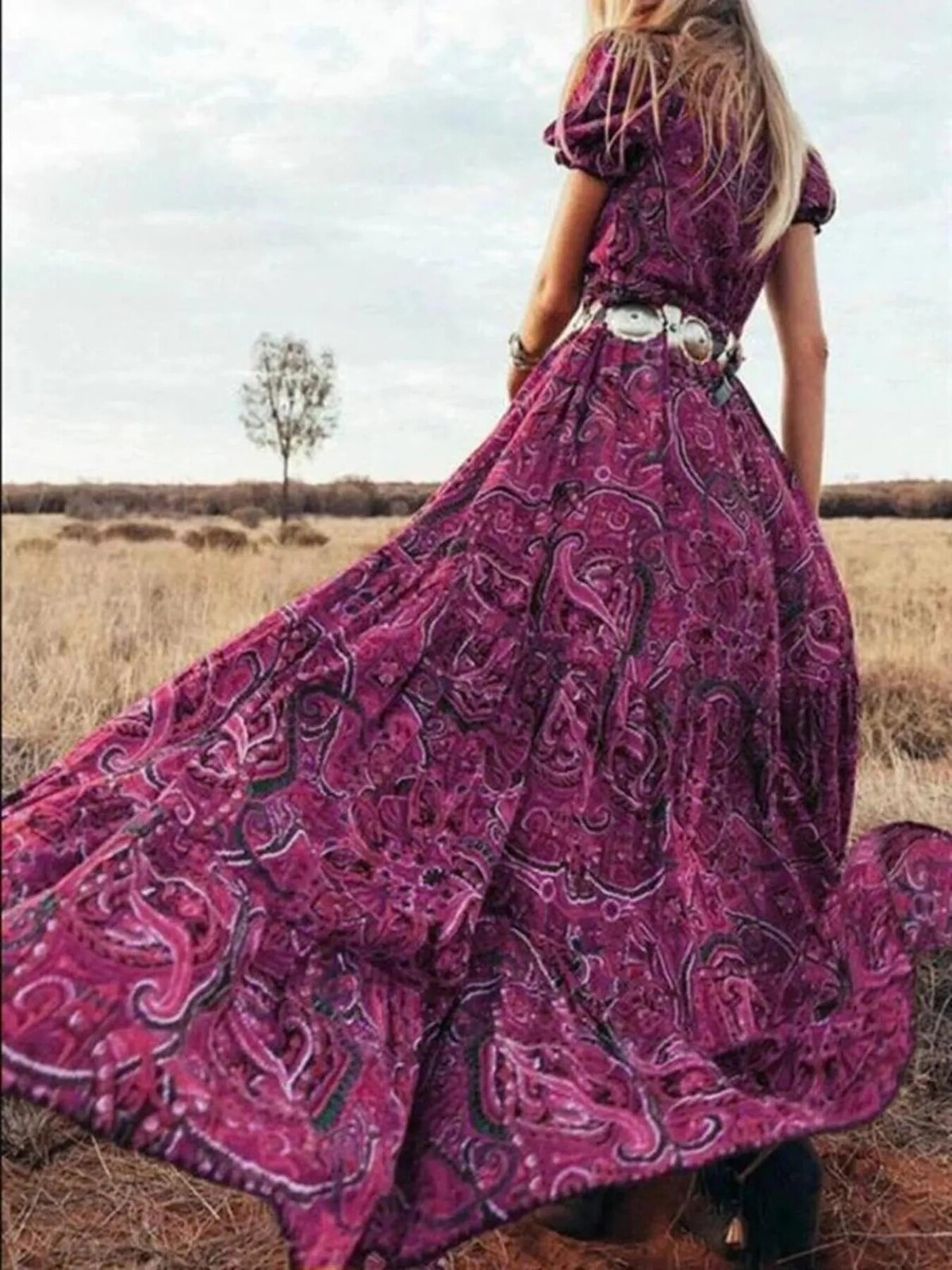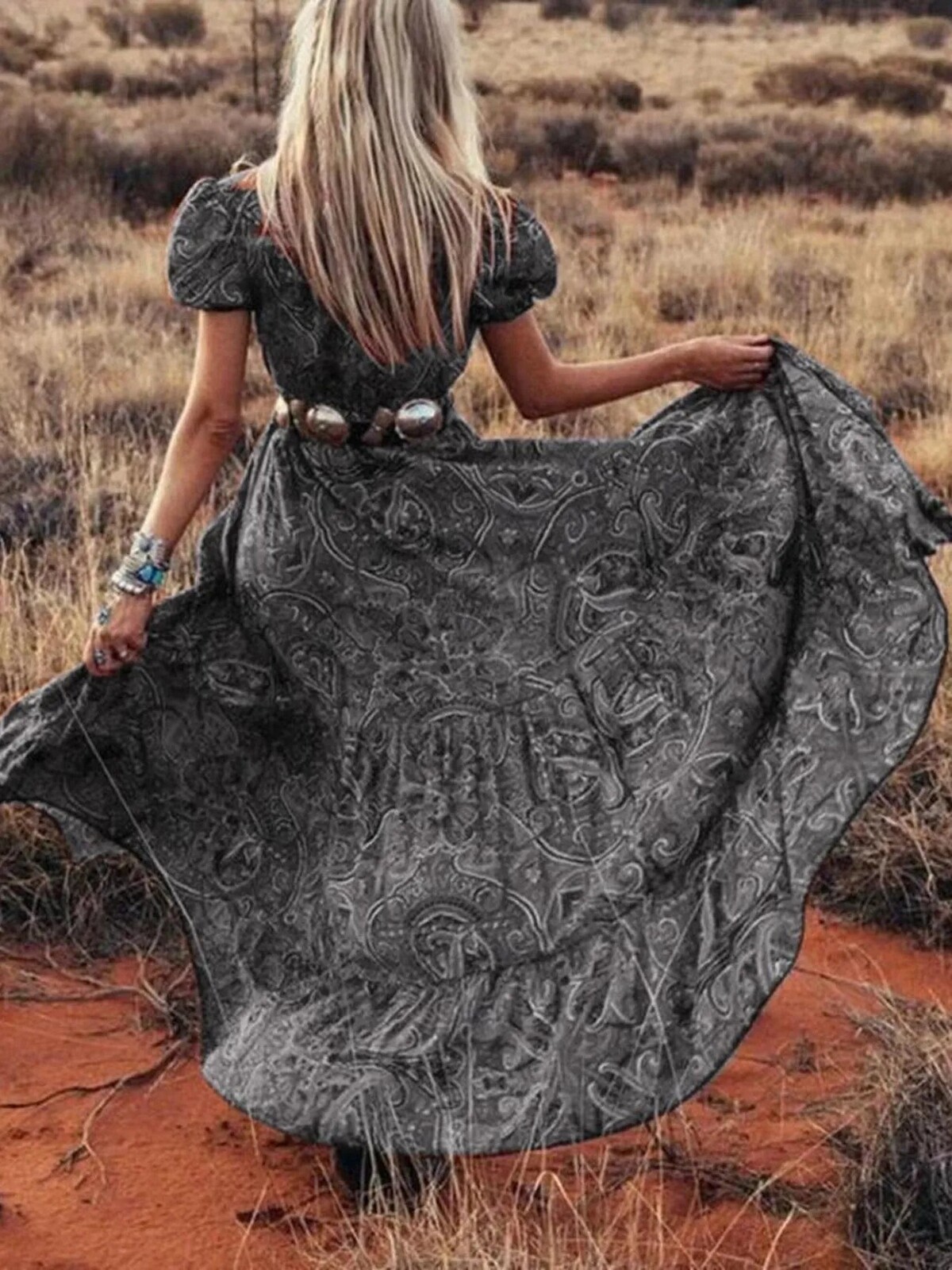 The swirling paisley print is intricate but not over-the-top. Perfect with cowboy boots or bare feet, depending on whether you’re heading to the local markets or waltzing across your living room. No stretch but plenty of comfort in its soft fabric - wear it out for fancy dinners or just a day outdoors… perhaps even an impromptu photo session in your backyard.