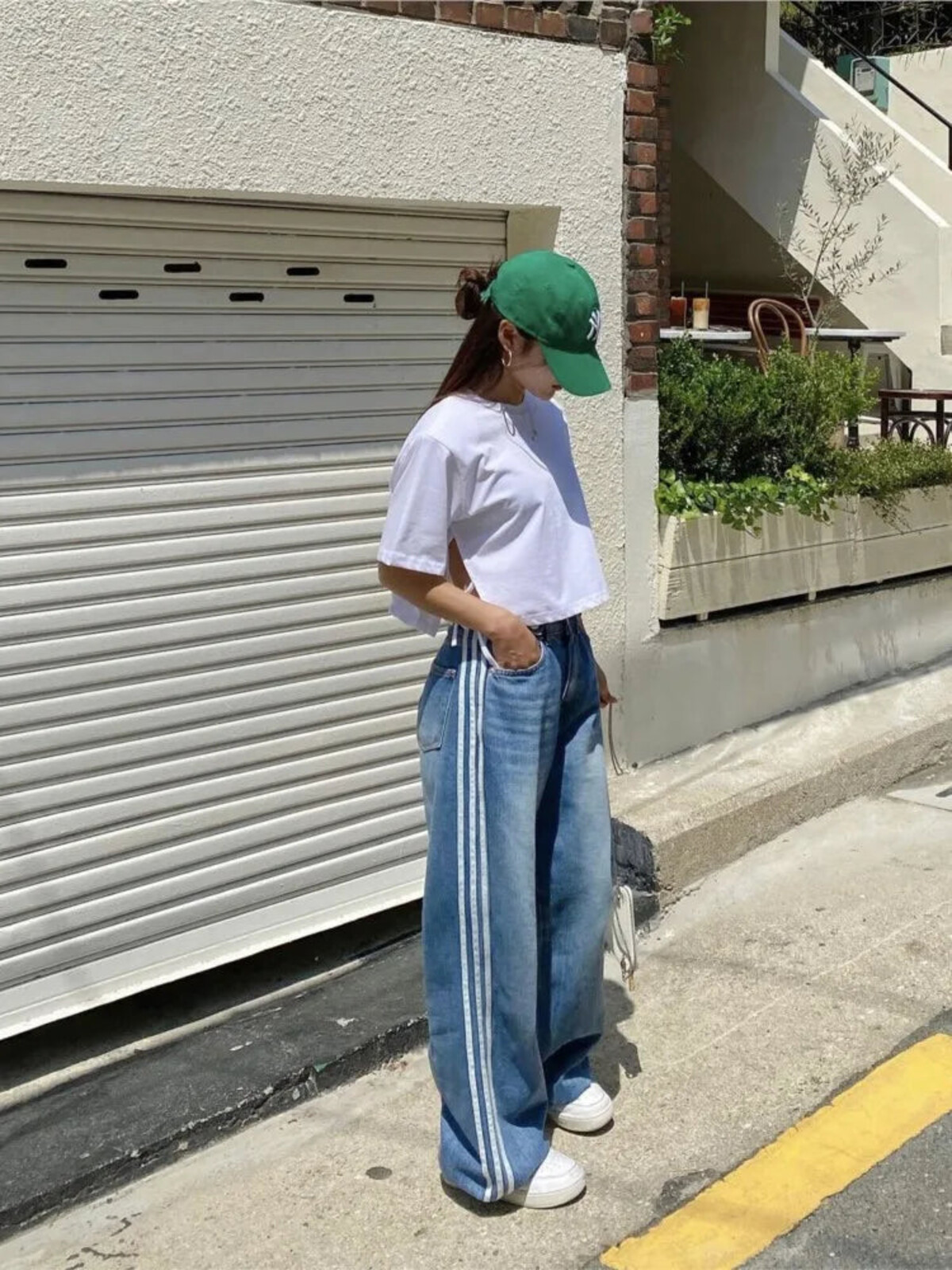 These jeans are surprisingly versatile - they work with streetwear, plain white tees, enormous jumpers or fitted knits tucked in. The stripes will always draw attention in a room full of boring trousers. There’s subtle pleating at the top, neat folds at the bottom hem and enough movement in those legs to keep your ego inflated all day long. They’re equal parts activewear nod and laid-back denim rebellion. And honestly - who doesn’t want to feel like they could outpace everyone else in style (if not in an actual race)?