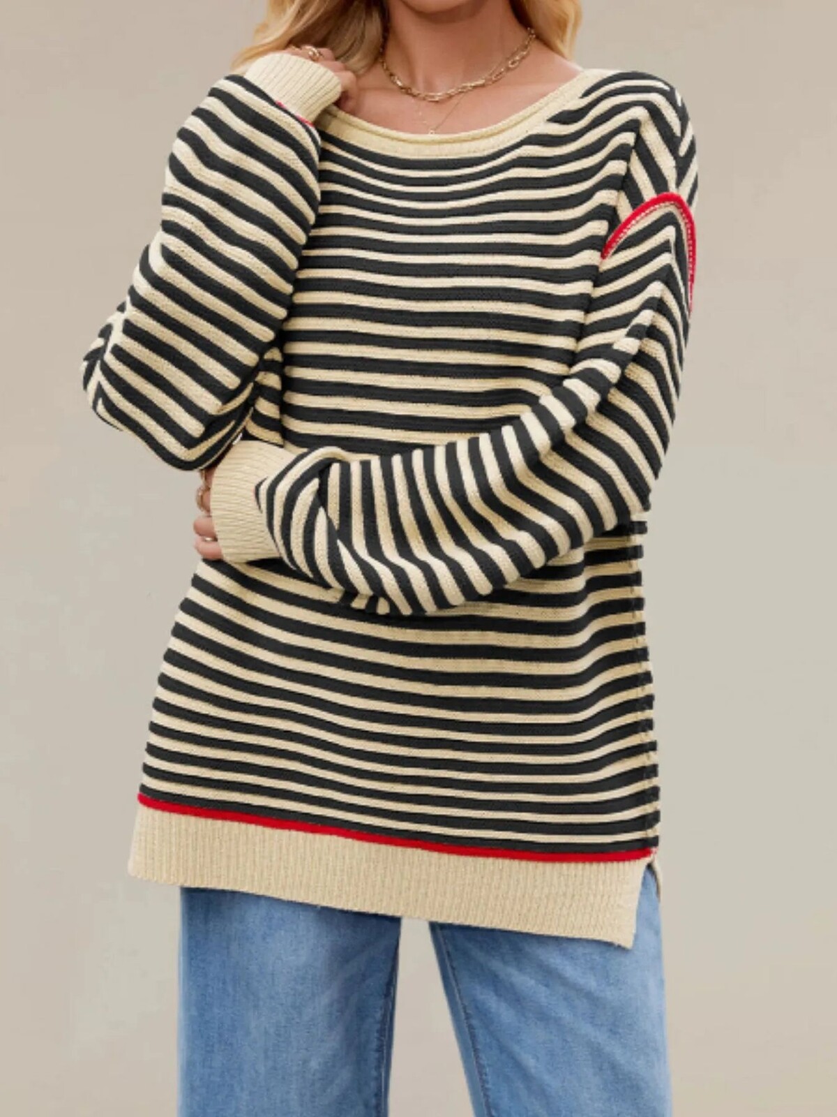 Sunlit Stripes has horizontal stripes - bold blocky ones in the main body, and smaller runways on the drop shoulder arms - finishing with a lovely ribbed cuff detail that says ‘this is quality’. The body and sleeves are finished with broad ribbed cuffs and a thick ribbed hemline, giving it that classic well structured silhouette.