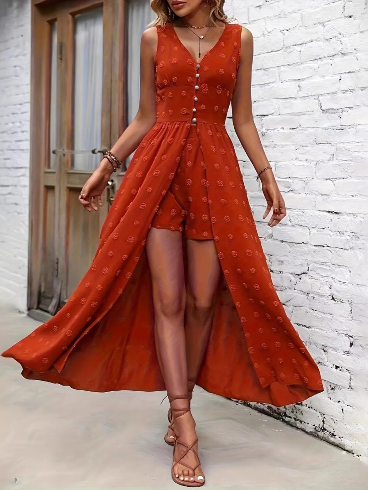 The intricate little circular motifs embroidered into the fabric add a touch of whimsy, while the V-neck, buttoned front, and fitted bodice shape things up nicely. And if you’re feeling daring (who isn’t on a Tuesday?), play with the overlay and switch from full coverage to a high-low look. If not, rest easy knowing this beauty is made of 100% polyester for zero stretch and all-day comfort. Perfect for minimalist bohemians (or anyone else, really) who don’t want to try too hard but still want to look like they might have tried harder than everyone else in the room. In short (pun intended), it’s got great bones - excellent for dinner dates or chasing dogs down a beach.