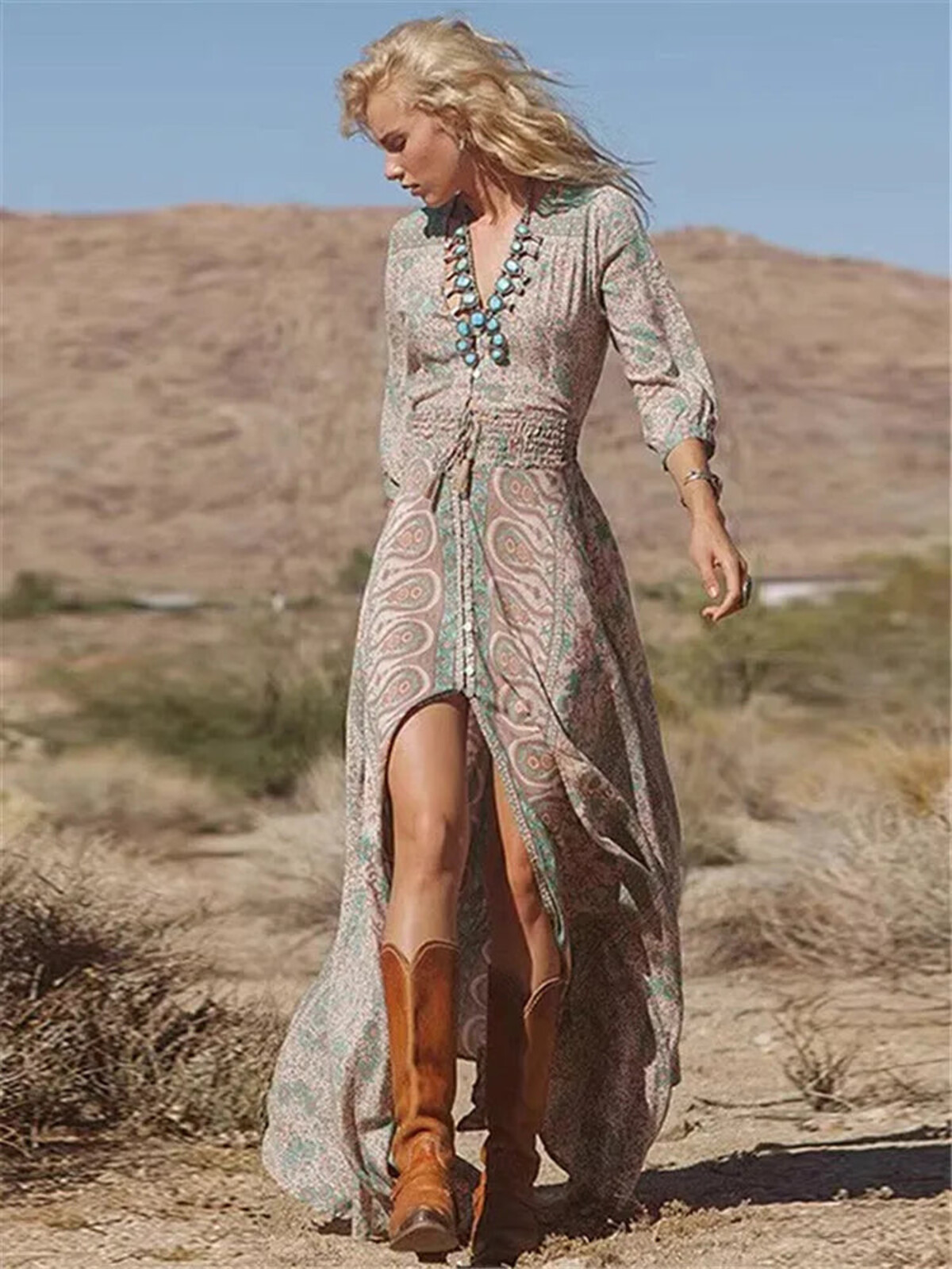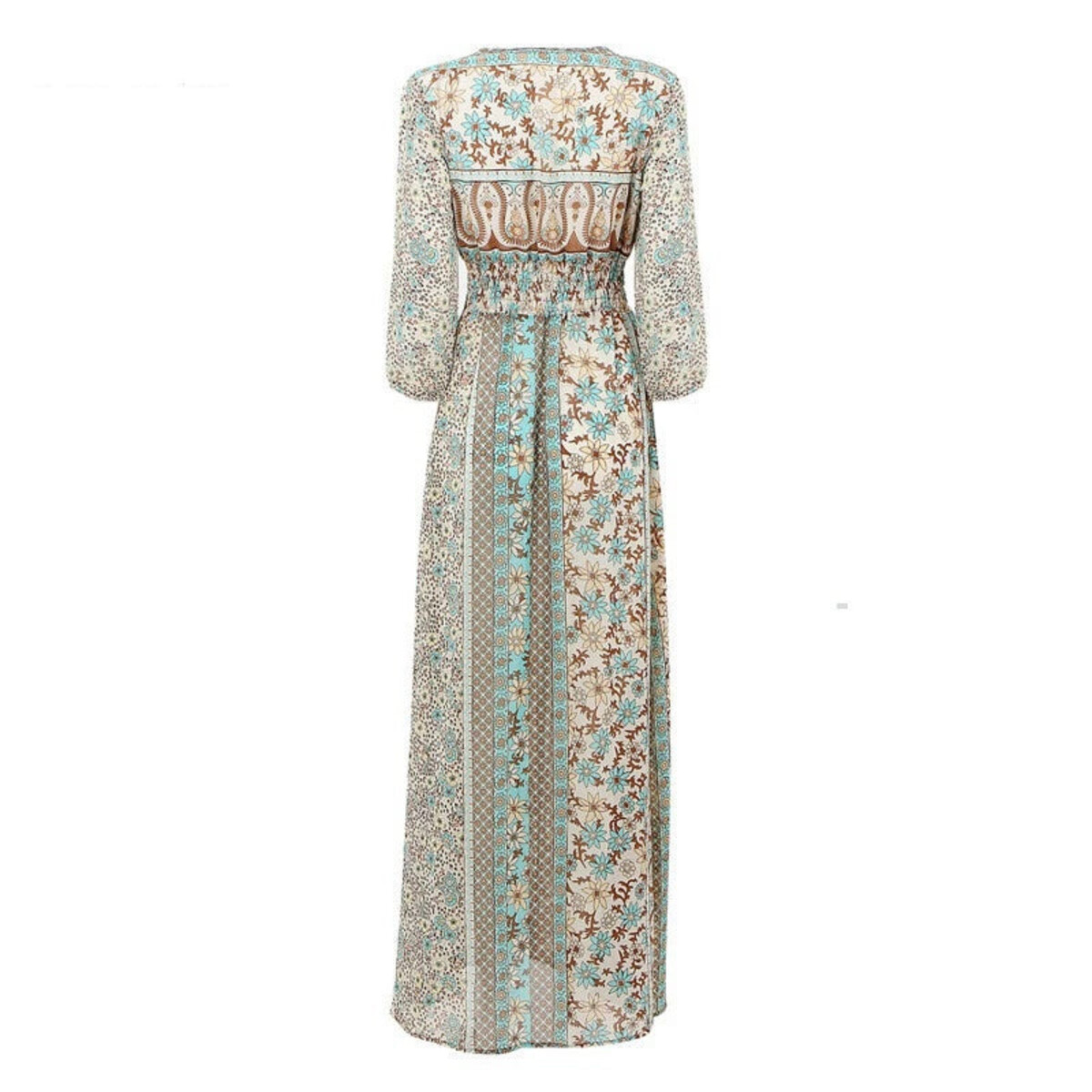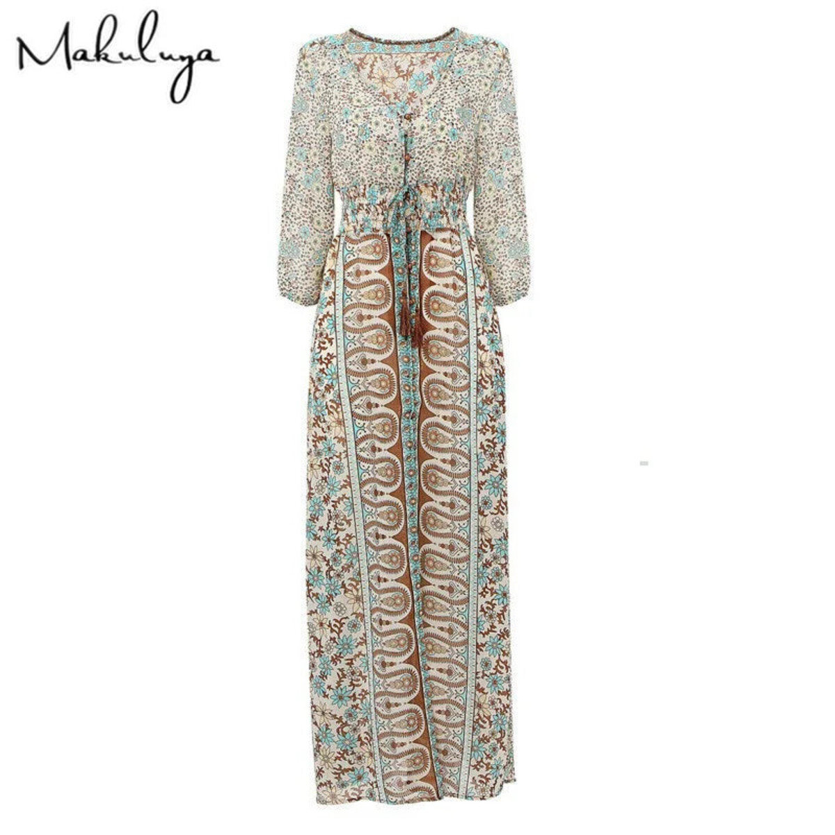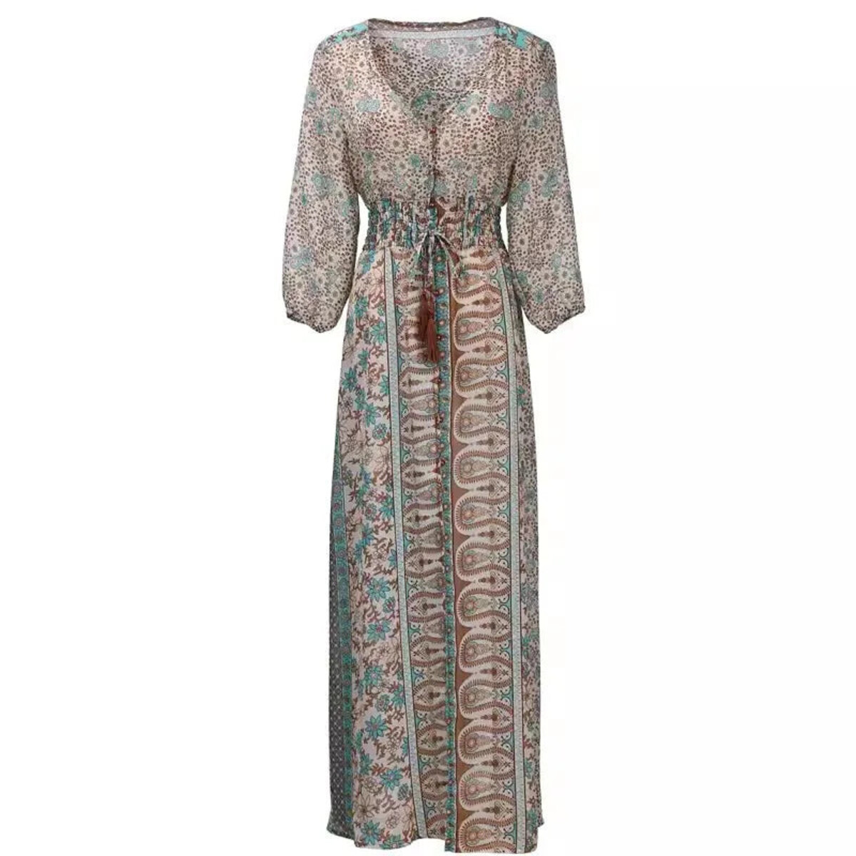 So, you know those moments when you want something easy and floaty but still need to look like you didn’t just roll out of bed in a rented beach shack? This is that dress. One of those gloriously bohemian maxi numbers that has it all - the shirt-style bodice so you can have as many or as few buttons done up as your heart desires, lovely three-quarter sleeves (a godsend if you’re not in the mood for a full show), and a waist that gives without making you look like a tube. You’ll find a bit of elastic smocking and drawstring action on both the sleeves and the middle for comfort, plus it’s all finished off with some playful tassels. There’s also this blissfully soft woven fabric situation happening - slightly sheer in places, very much “I swan about on a sun-drenched balcony” in others.